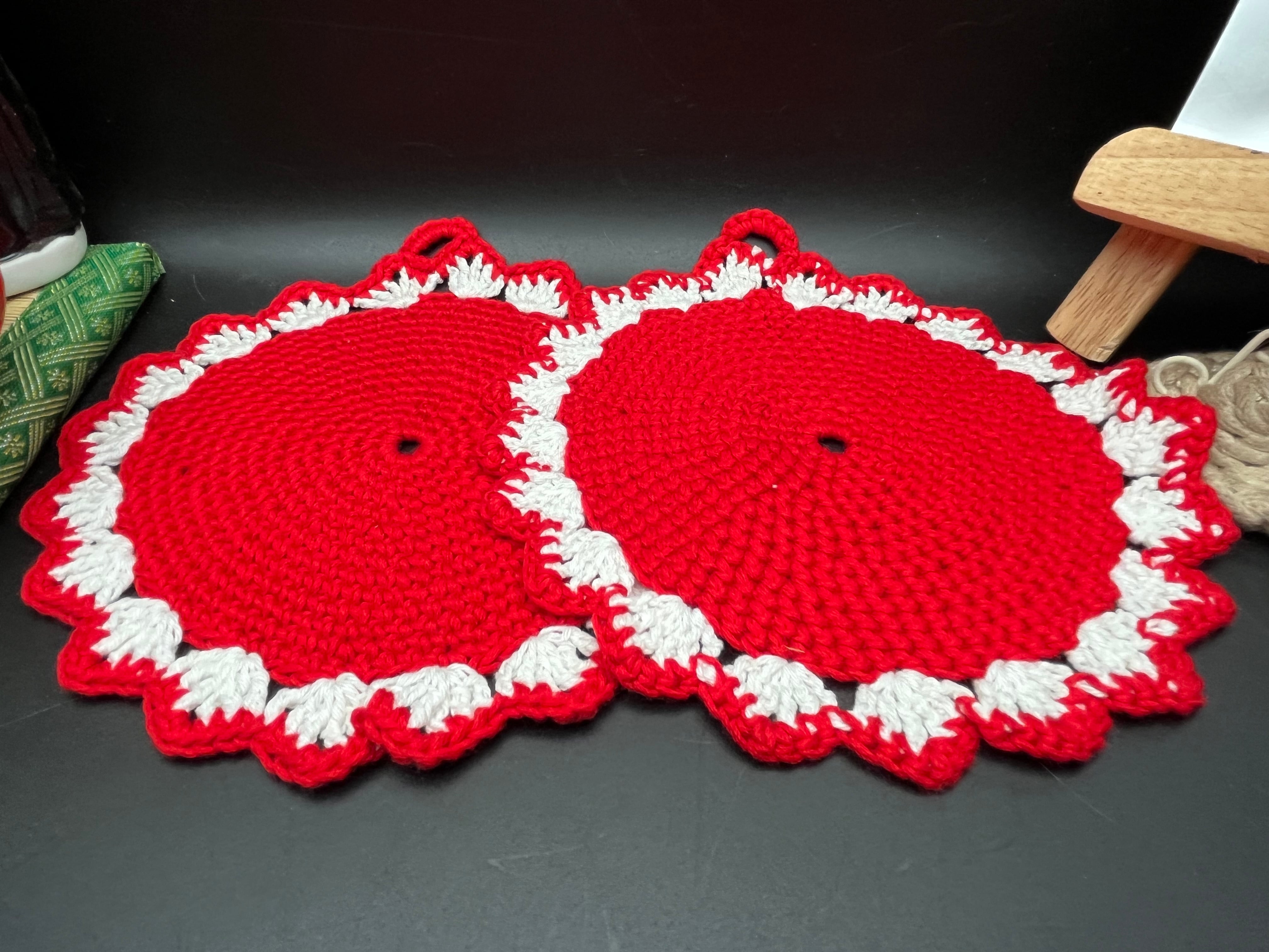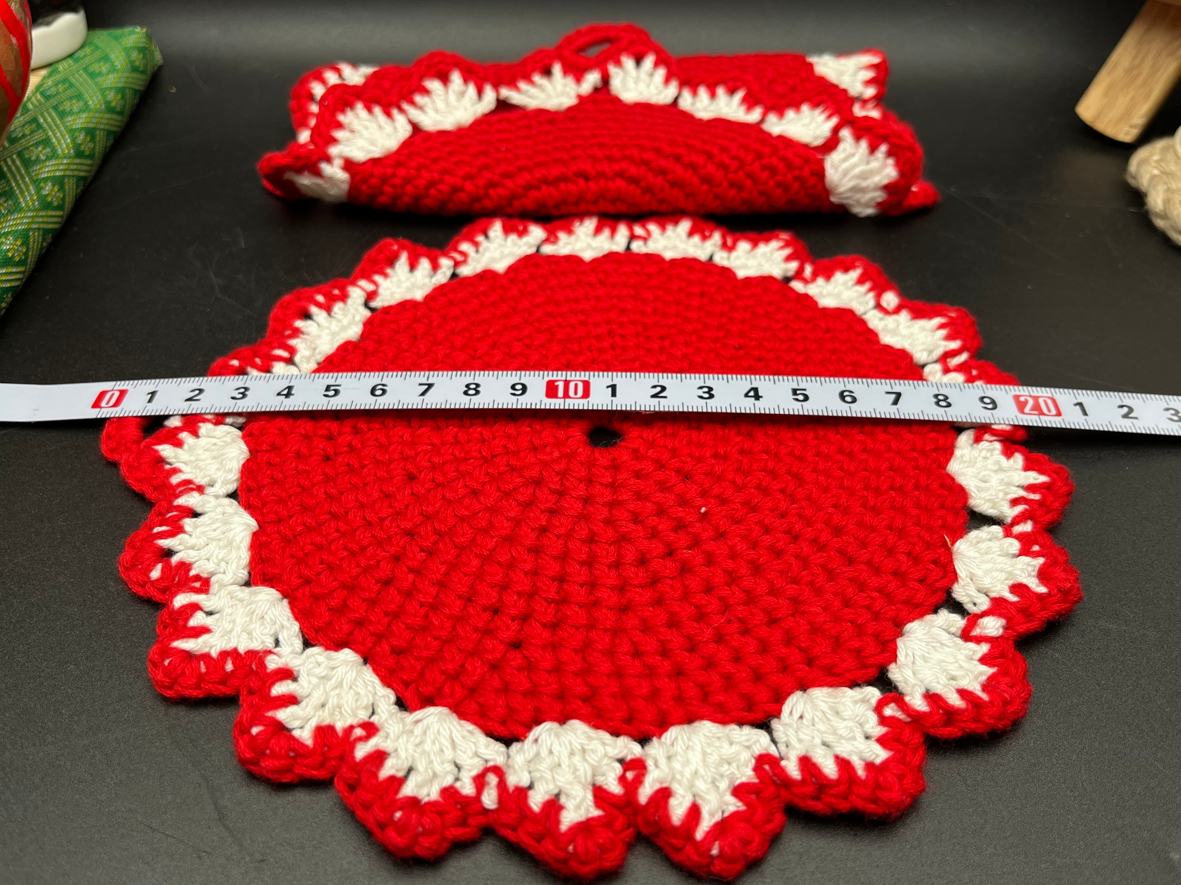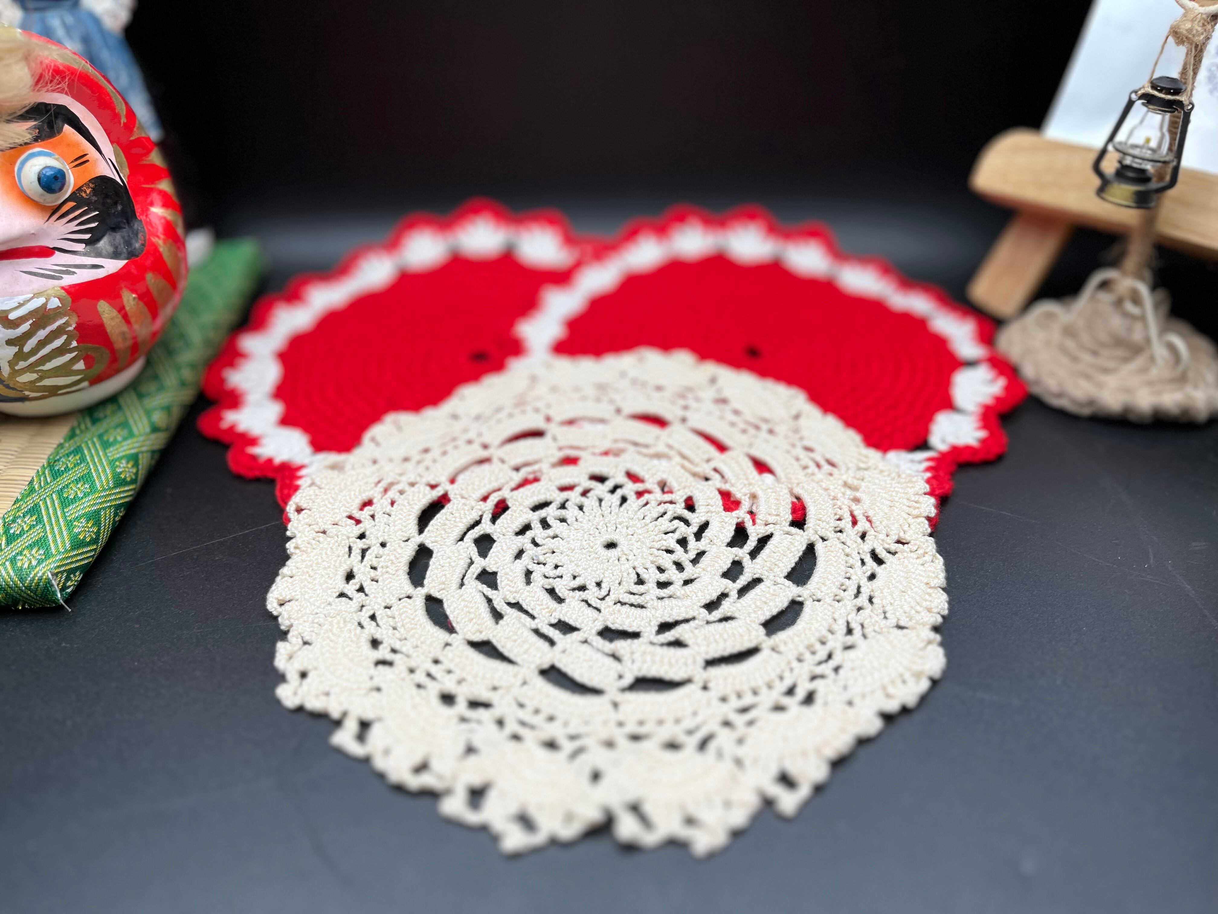 特に赤いレースドイリーは、1970年代のハンドメイド雑貨を思わせる温かみのあるビビッドカラーで鍋つかみなどにも使えます。