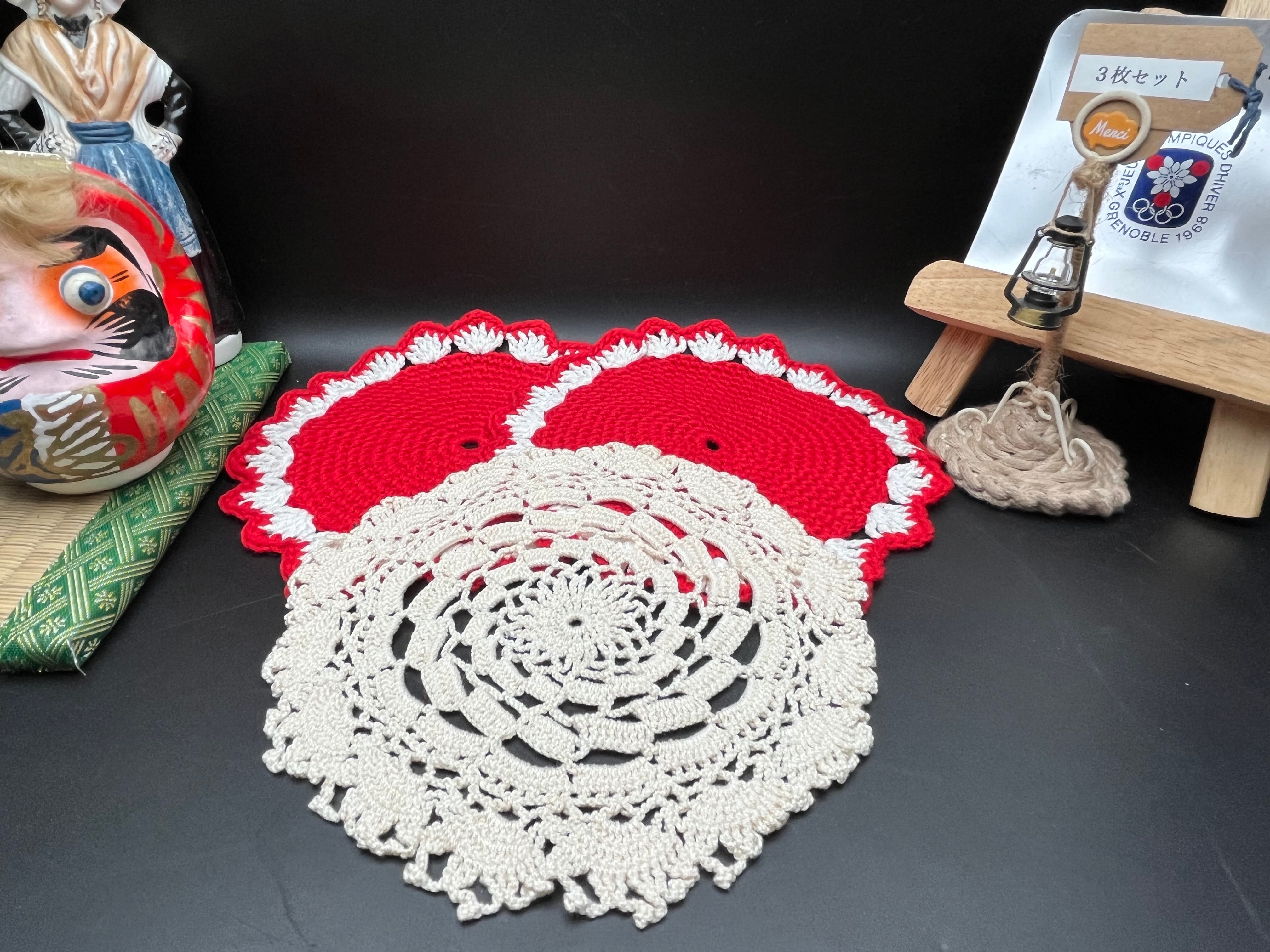 赤×白の可愛いビンテージレースドイリーと繊細な生成りレースドイリーの 3枚セットです。