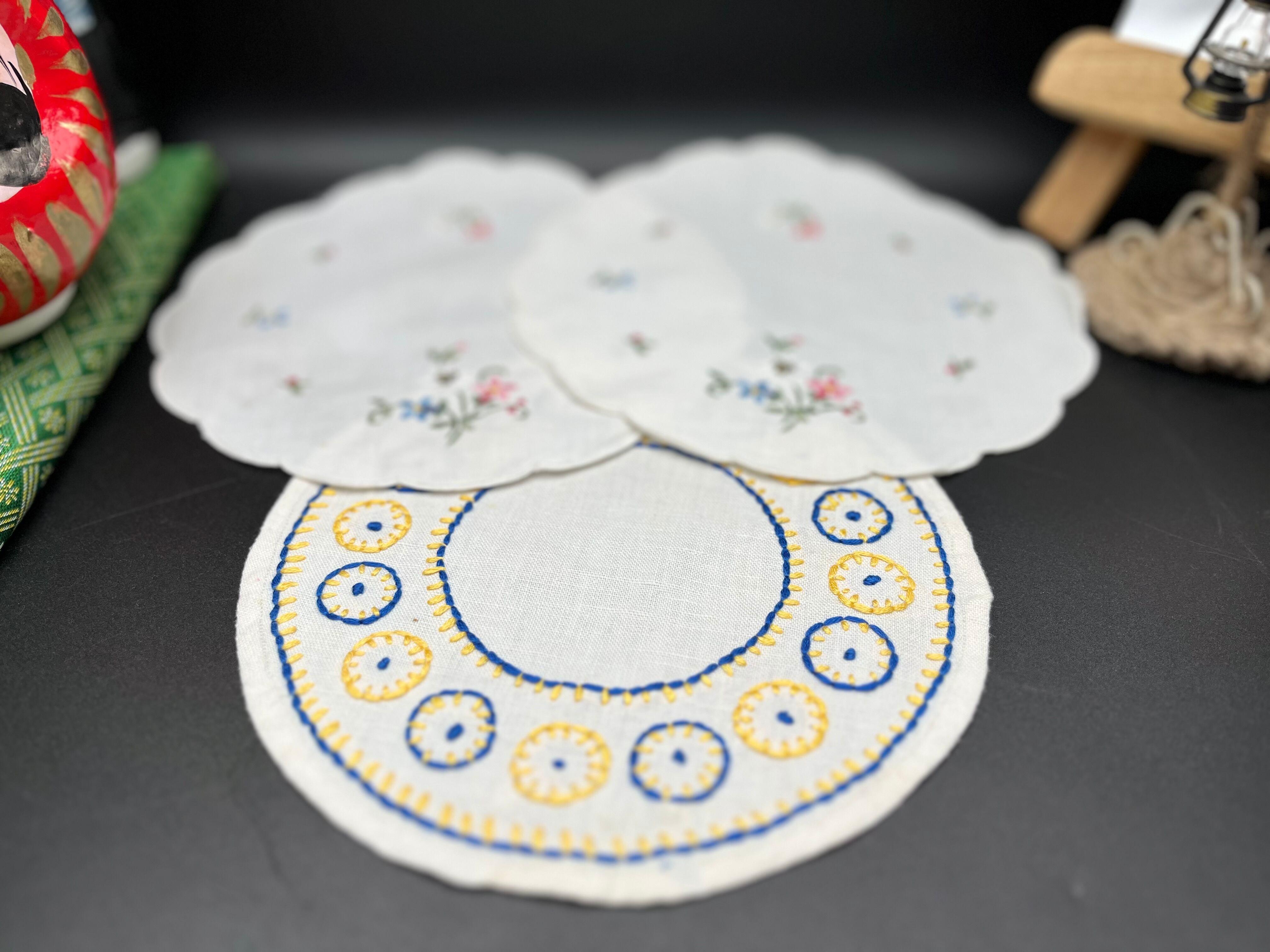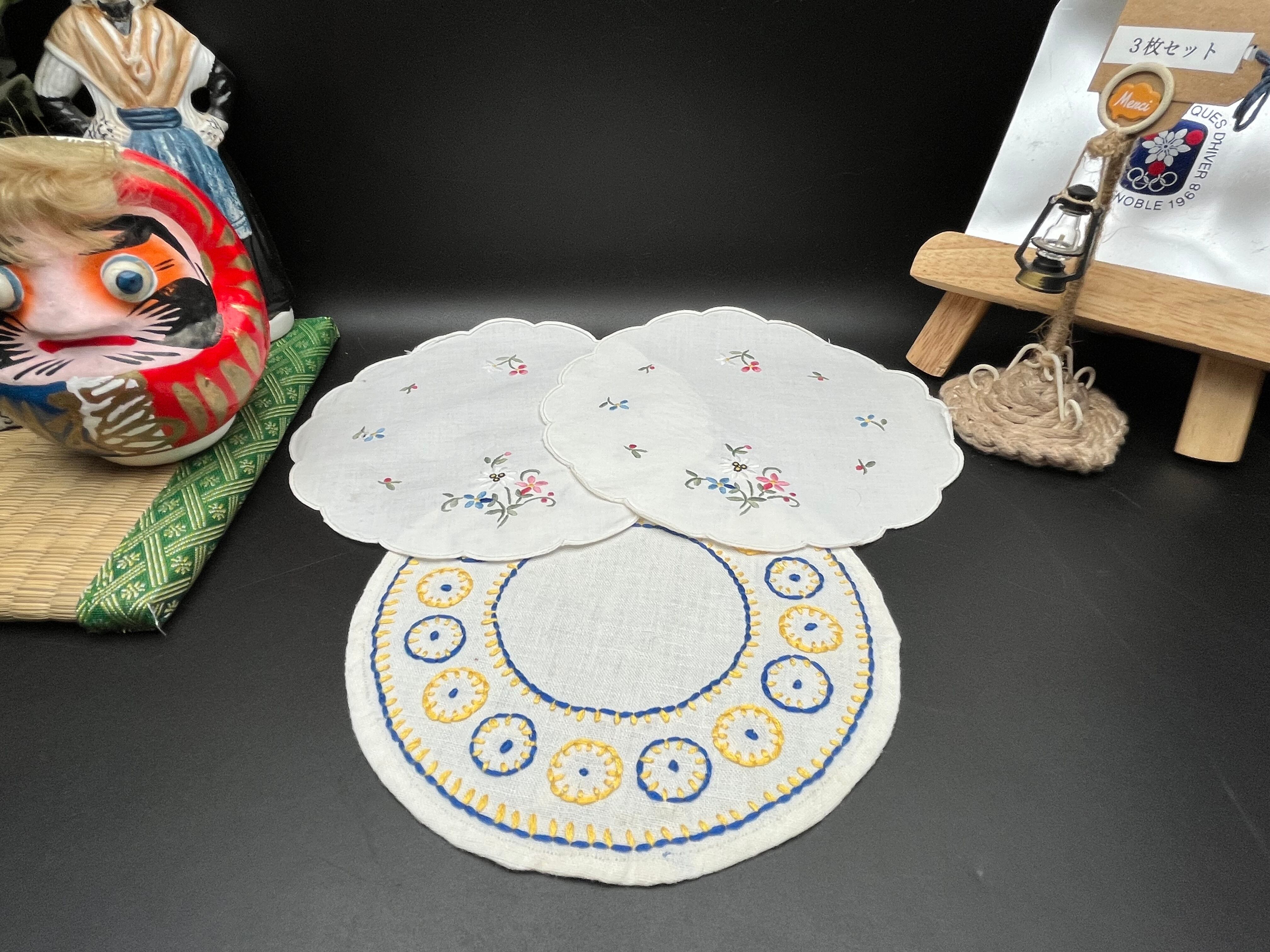 花刺繍&北欧ステッチアンティーク刺繍ドイリー 3枚セット
