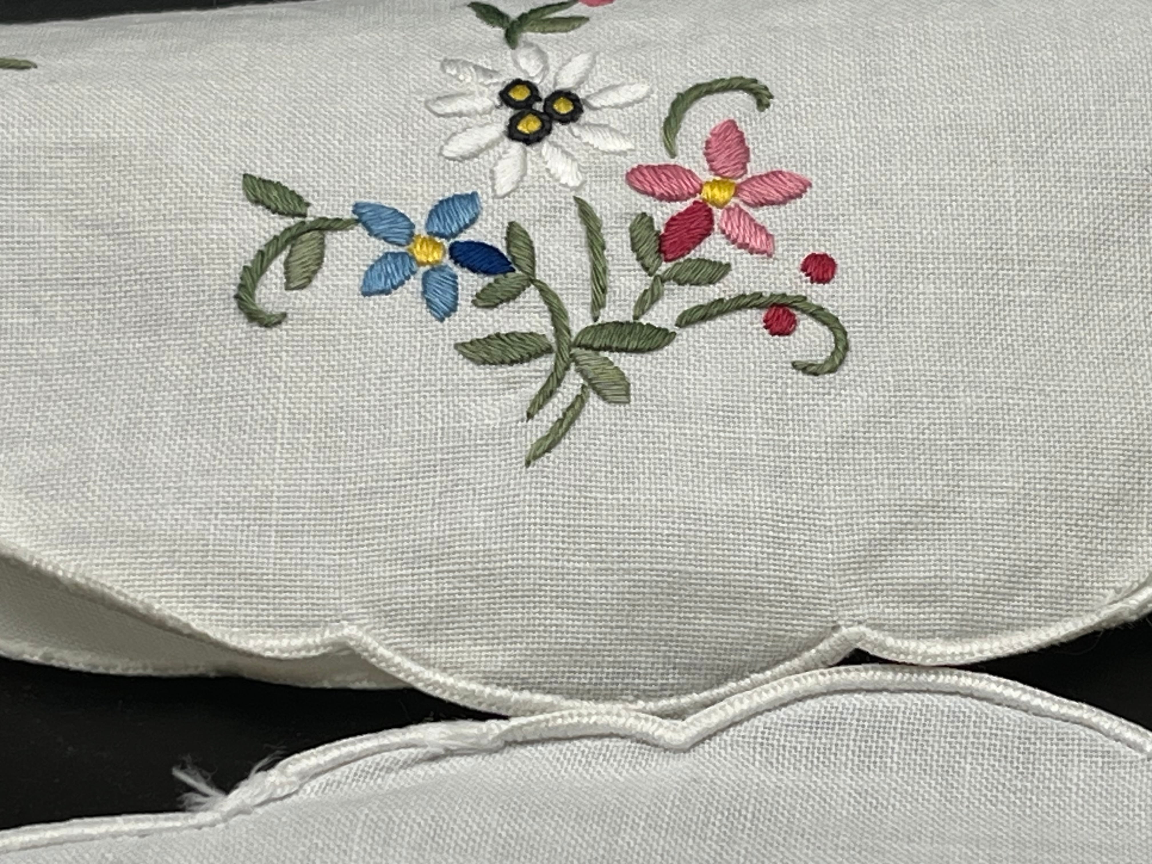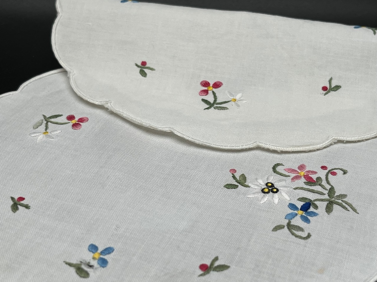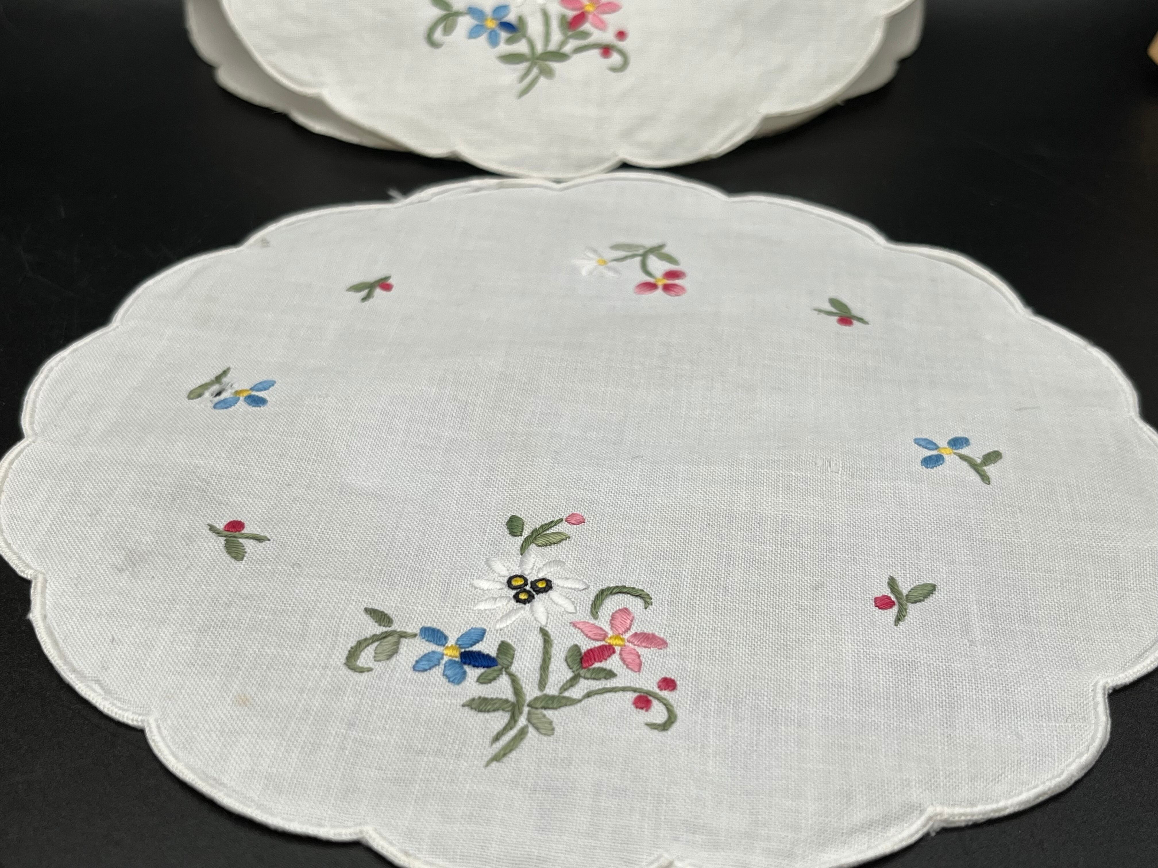 花刺繍ドイリーは、白いリネンに色とりどりの小花が施された可憐なデザイン。縁はスカラップ仕上げで、ティータイムや来客時の敷物として特に人気があります。