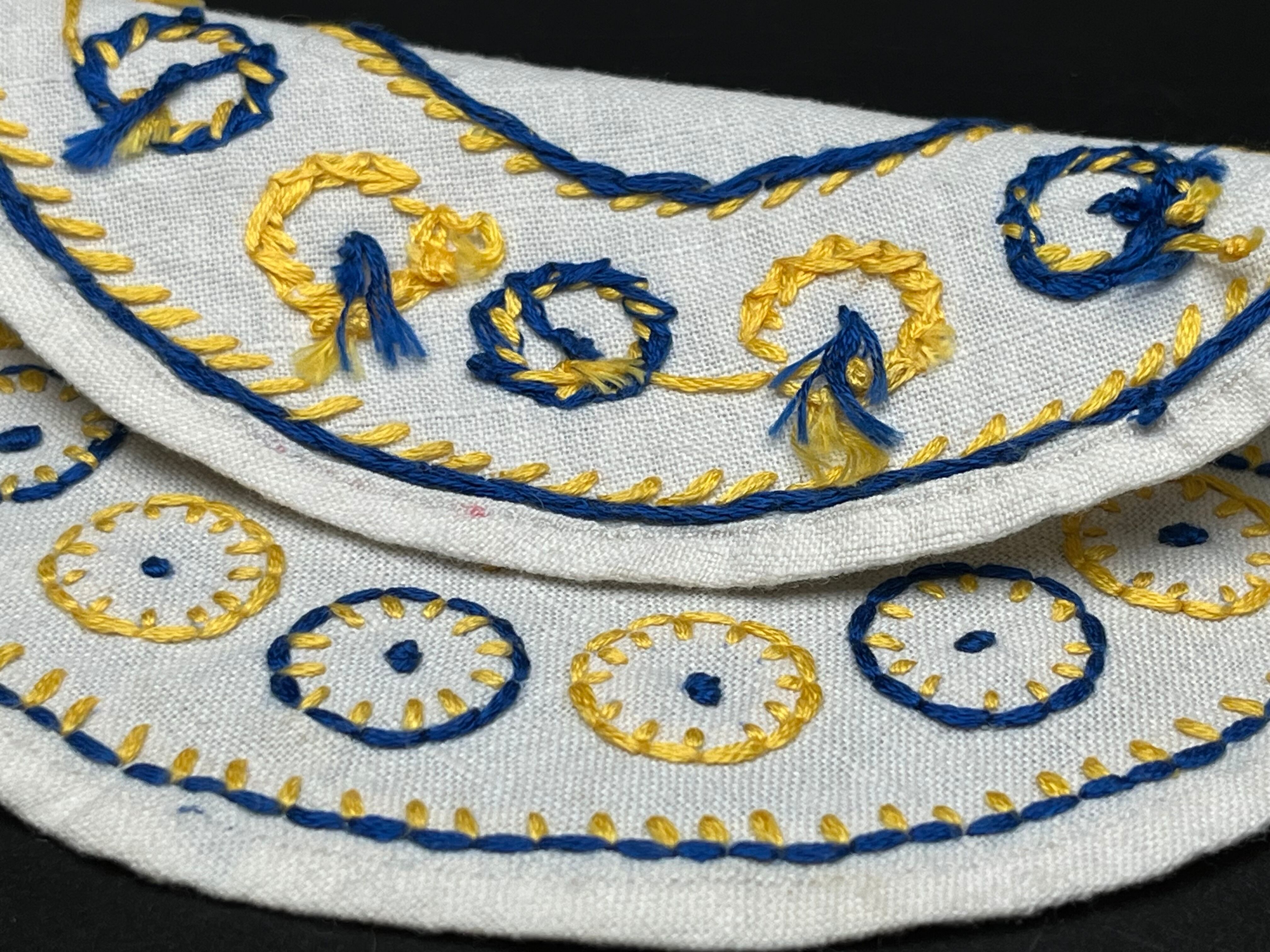 幾何学ステッチの一枚は、青と黄色のしっかりとした刺繍が施され、北欧ヴィンテージのような雰囲気。食器映えする一枚で、インテリア性も高い作品です。