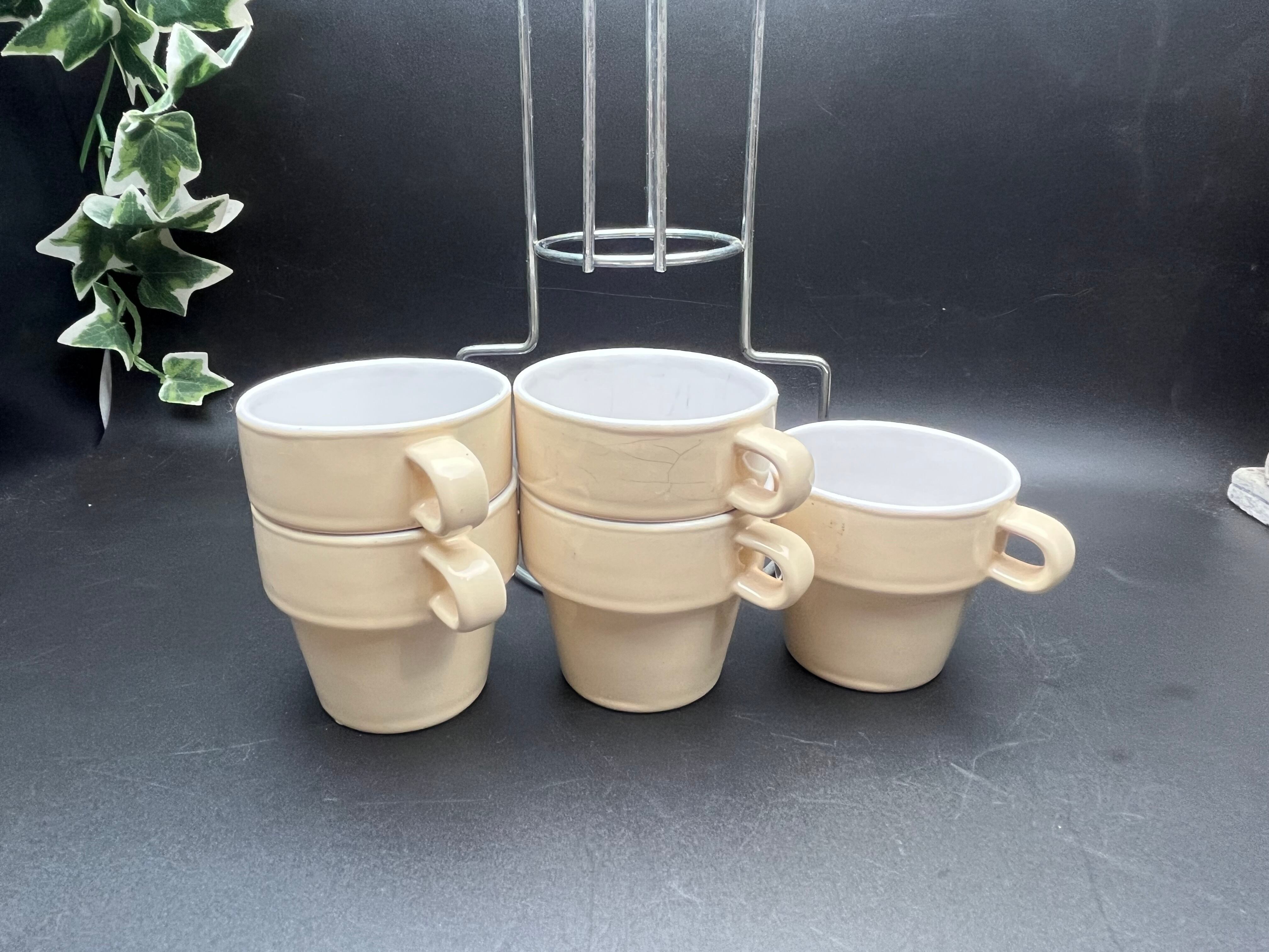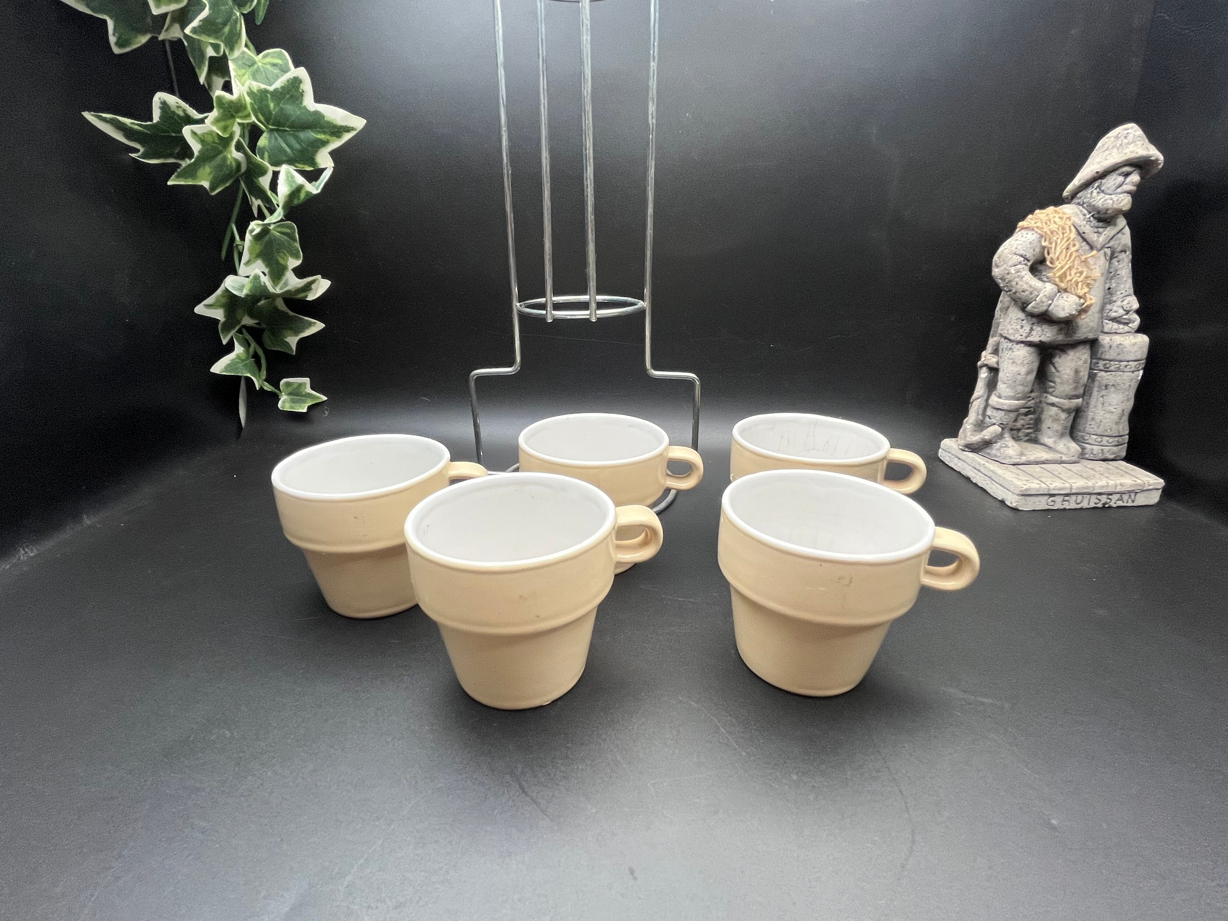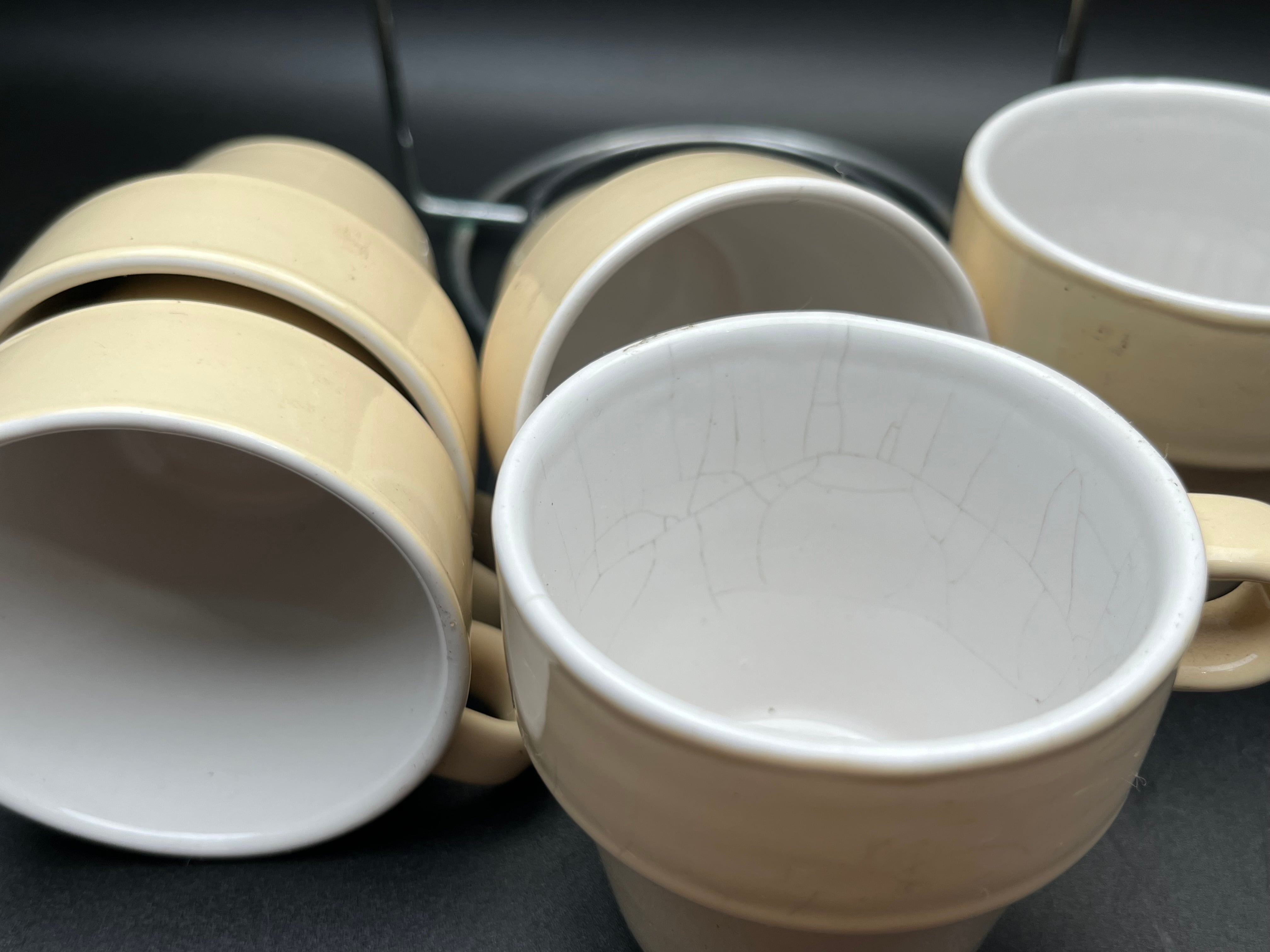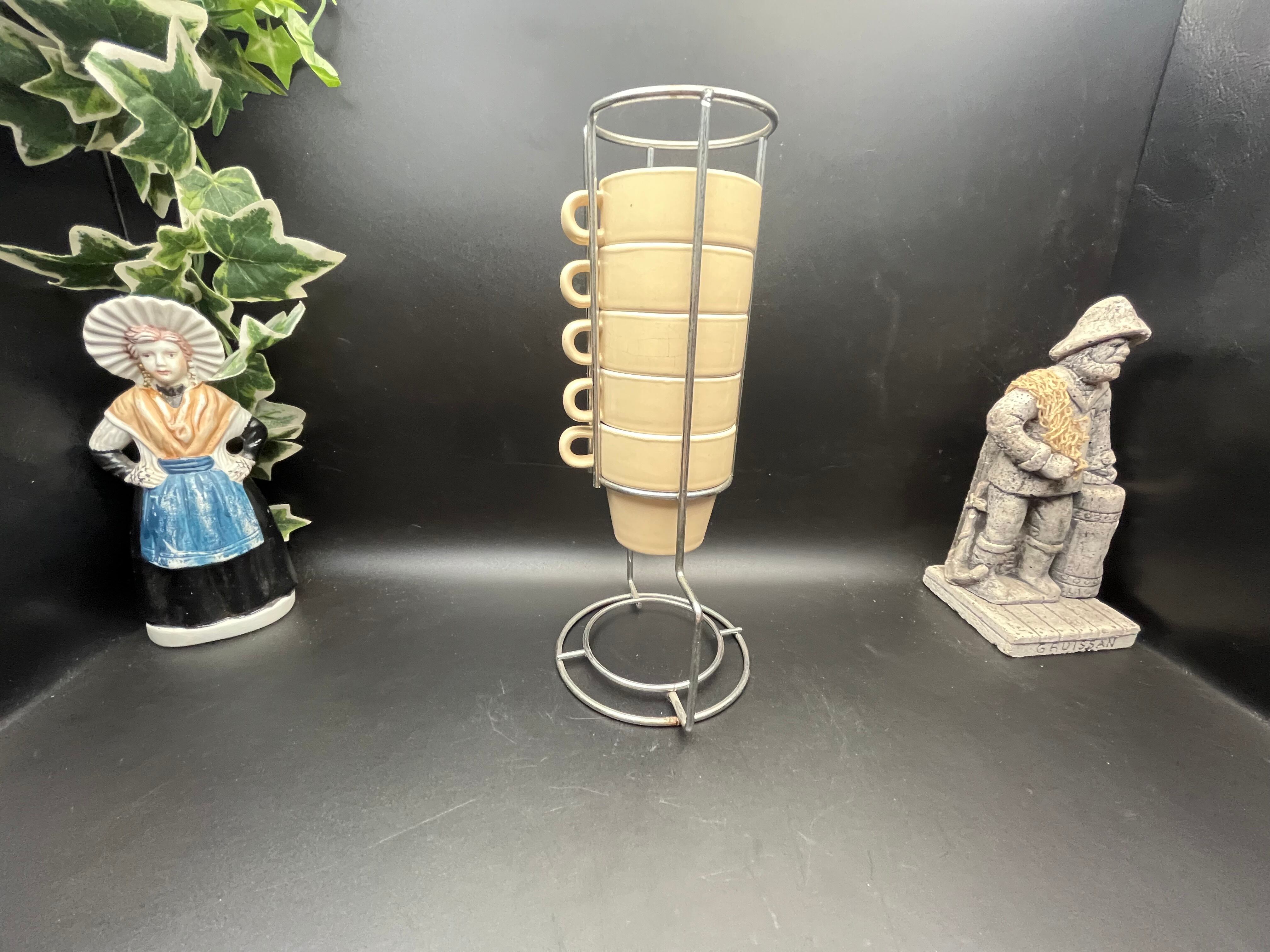 ベージュカラーの陶器製カップは、内側が白釉仕上げになっており、外側とのコントラストが美しいデザイン。付属のメタルスタンドに縦に積み重ねて収納でき、キッチンやカフェのディスプレイとしてもスタイリッシュに映えます。カップには経年による貫入や小傷が見られますが、それもアンティークの魅力として独特の表情を与えています。普段使いはもちろん、インテリアのアクセントや撮影用小物としてもおすすめです。