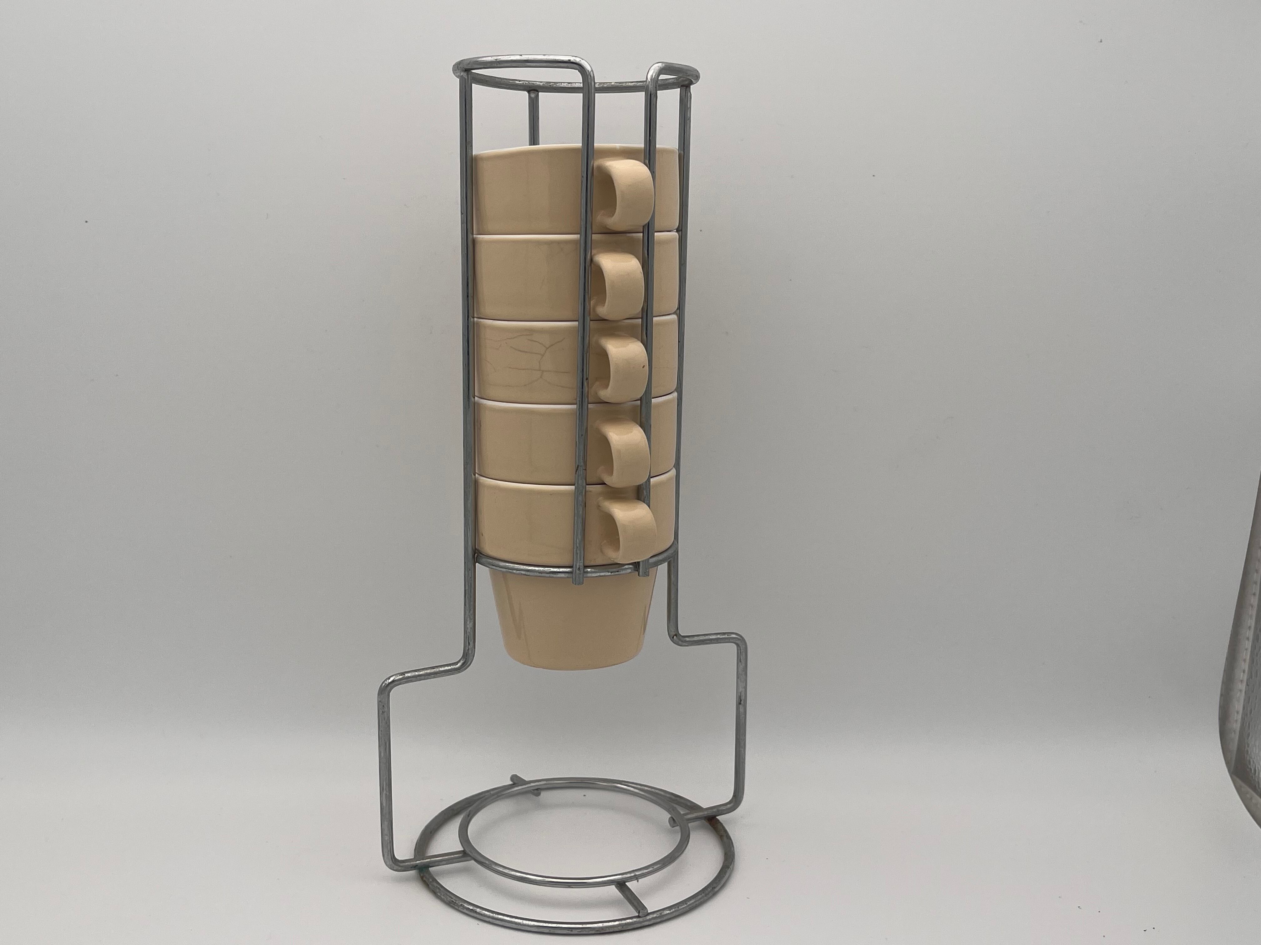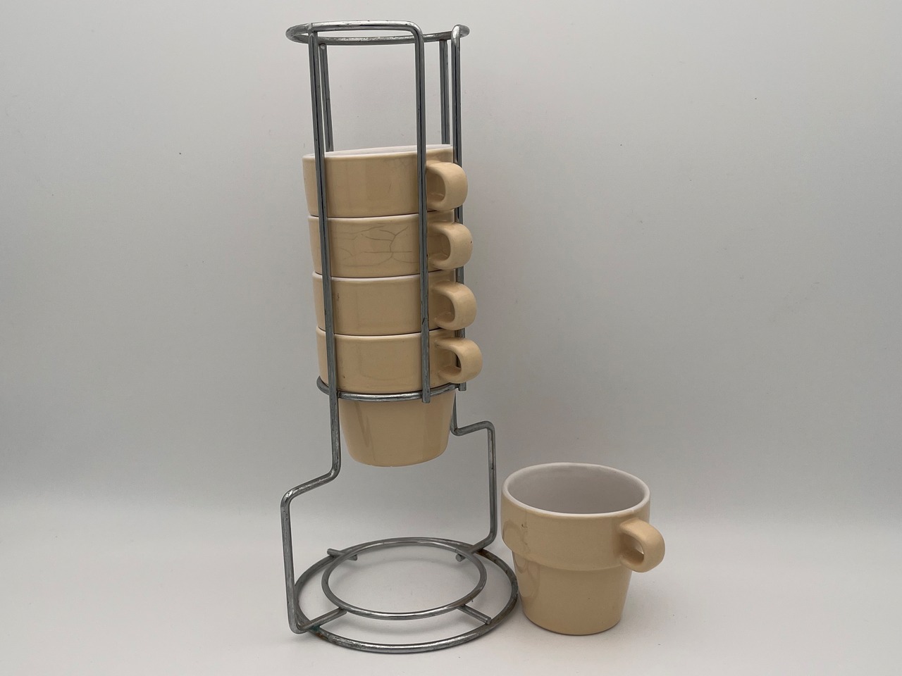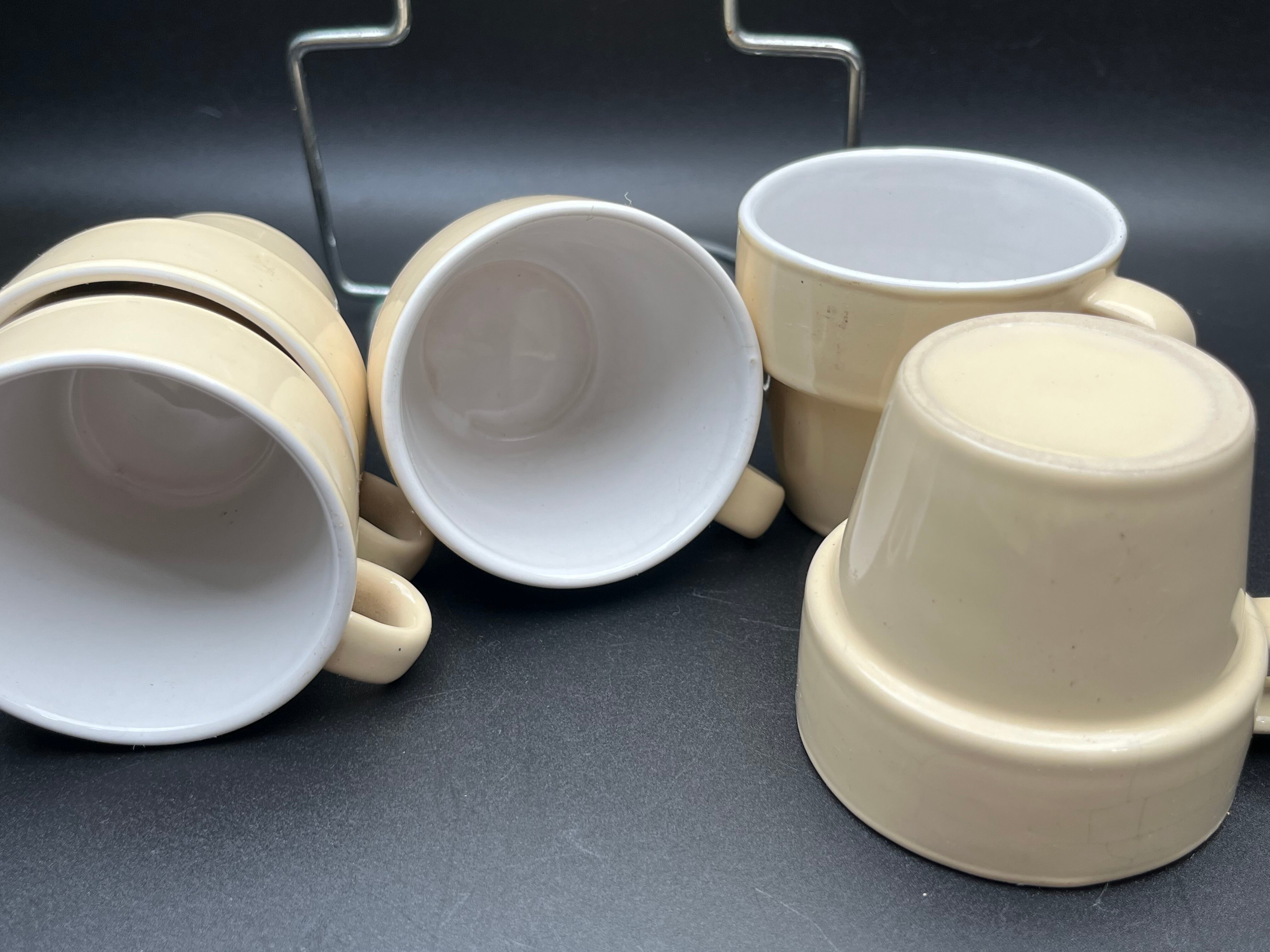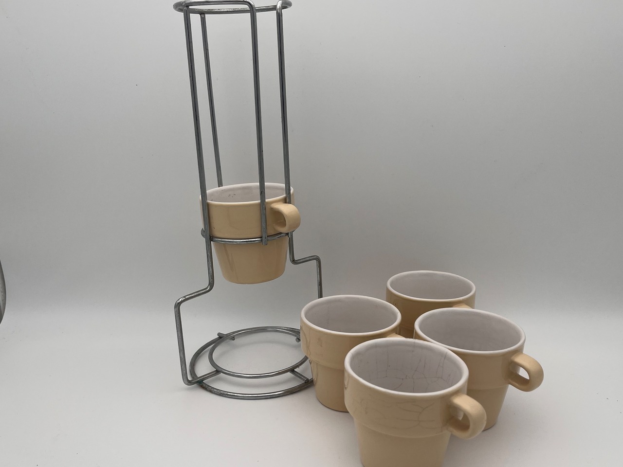 ベージュカラーの陶器製カップは、内側が白釉仕上げになっており、外側とのコントラストが美しいデザイン。付属のメタルスタンドに縦に積み重ねて収納でき、キッチンやカフェのディスプレイとしてもスタイリッシュに映えます。カップには経年による貫入や小傷が見られますが、それもアンティークの魅力として独特の表情を与えています。普段使いはもちろん、インテリアのアクセントや撮影用小物としてもおすすめです。