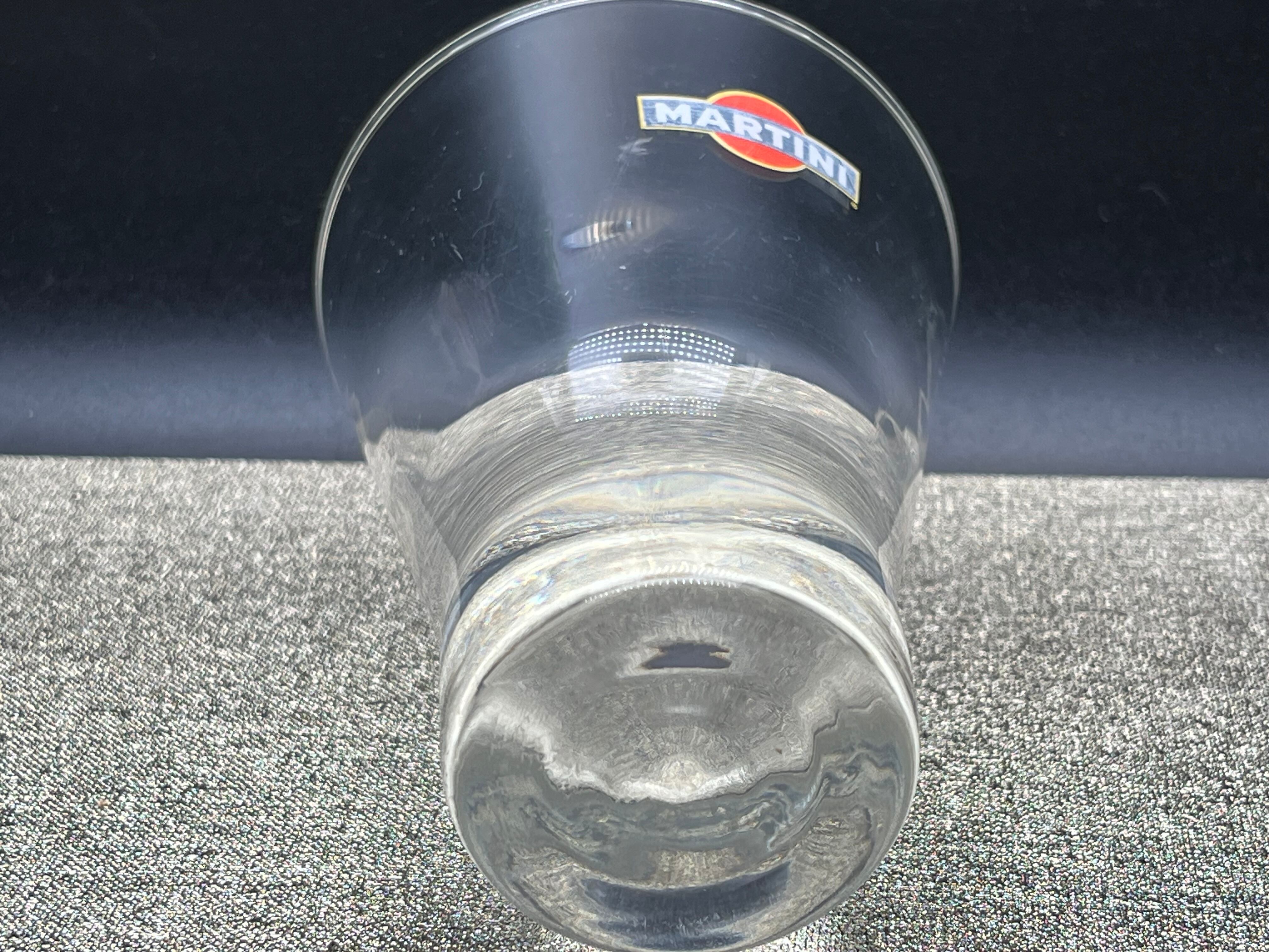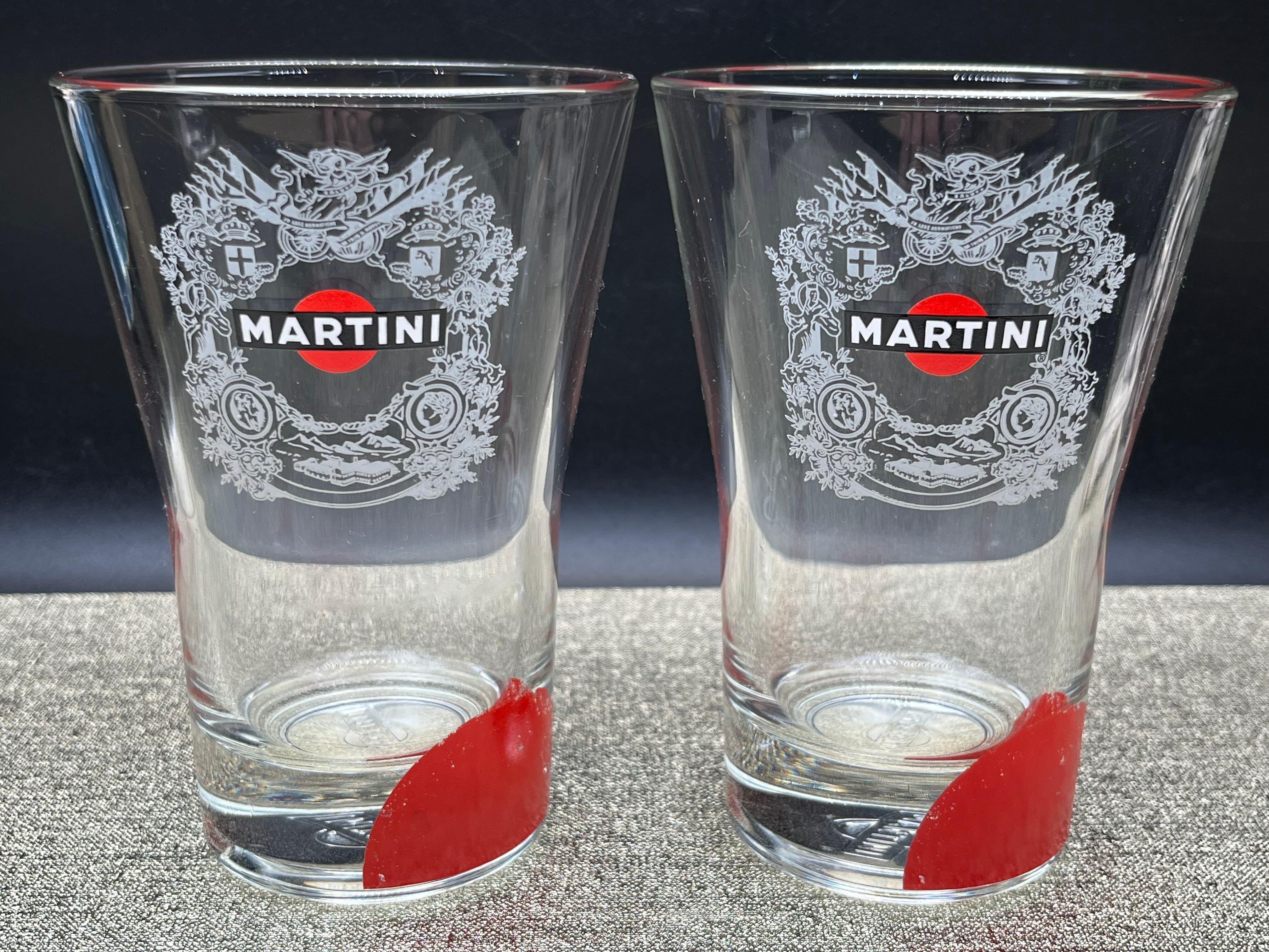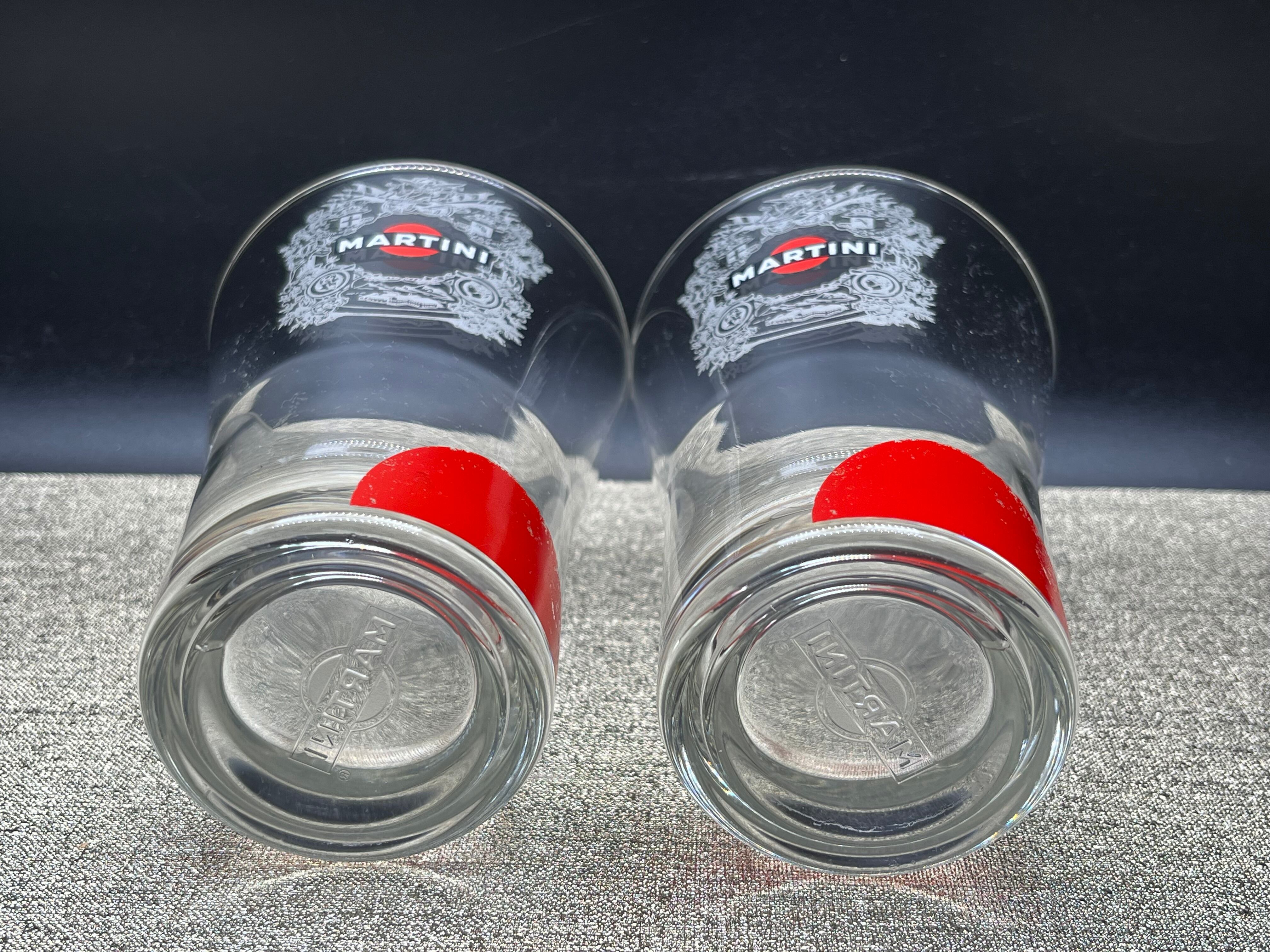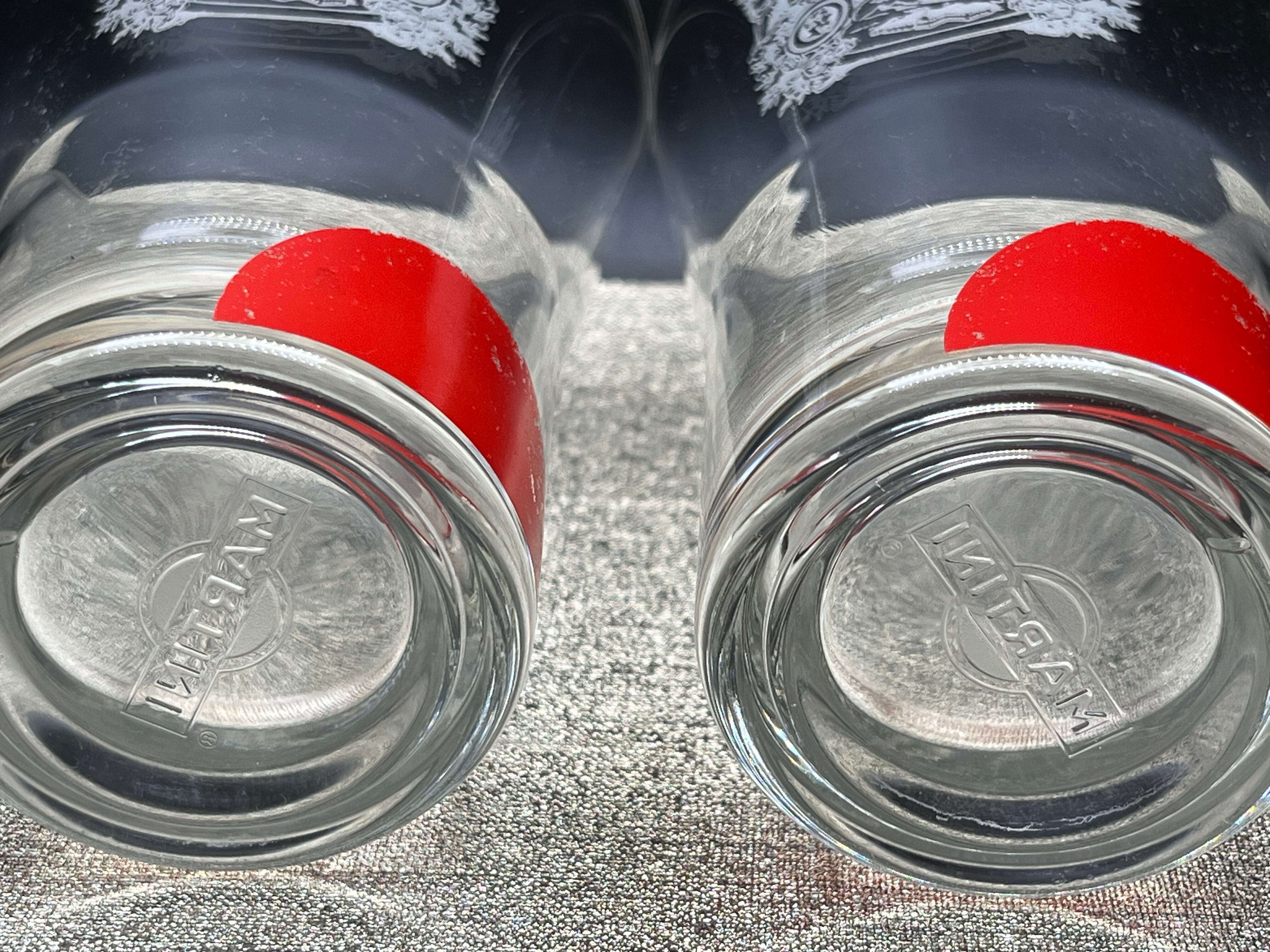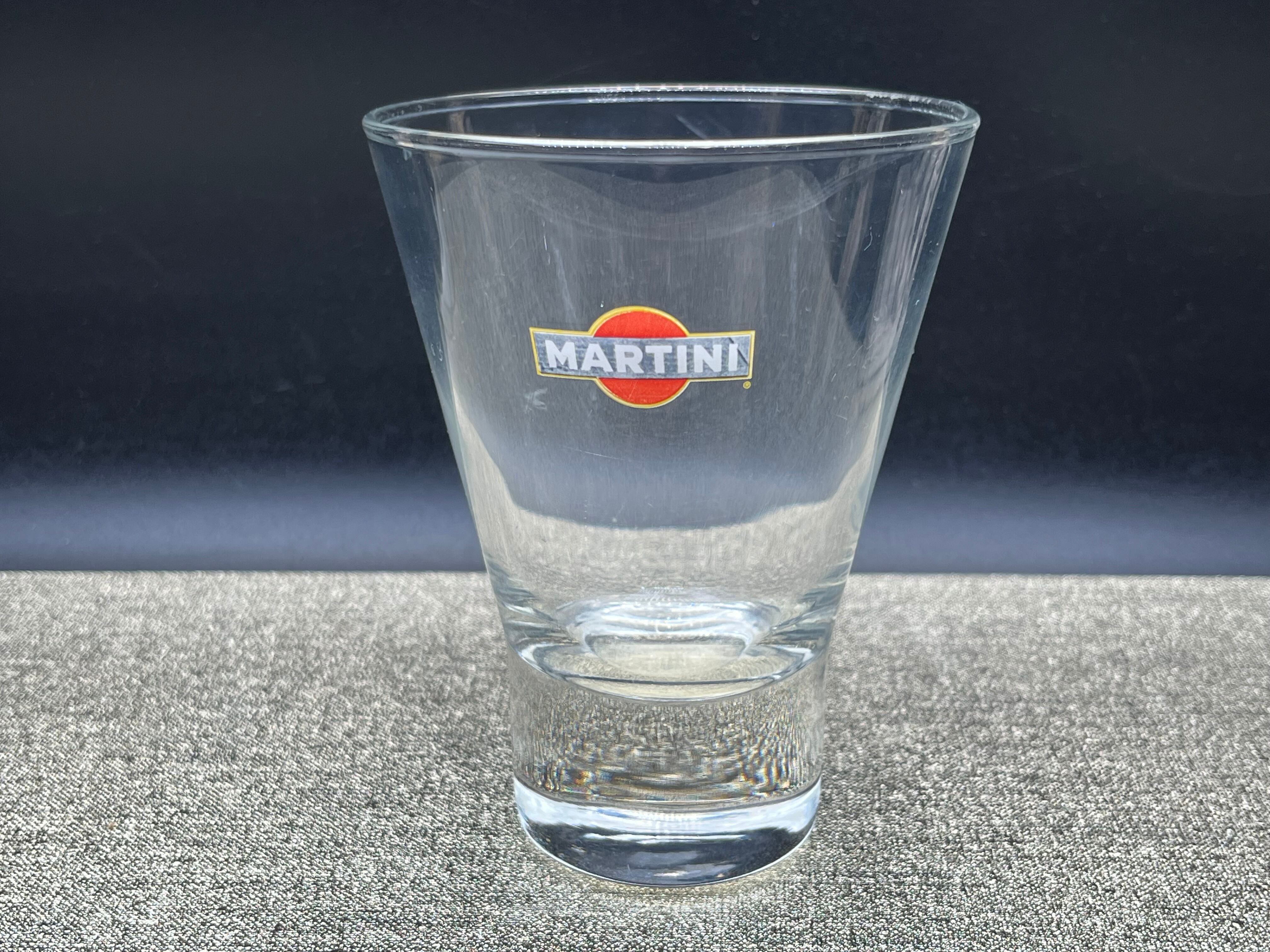グラス表面には赤いサークルと「MARTINI」のブランドロゴが大胆に配置され、2点はエンブレム調の紋章デザイン入り、もう1点はシンプルなロゴタイプと、それぞれ異なるデザインが魅力です。厚みのあるガラス製で、ショートカクテルやベルモット、リキュール、ビターズなどのサーブに最適。バーグッズやホームバーを演出するインテリアアイテムとしても存在感を放ちます。