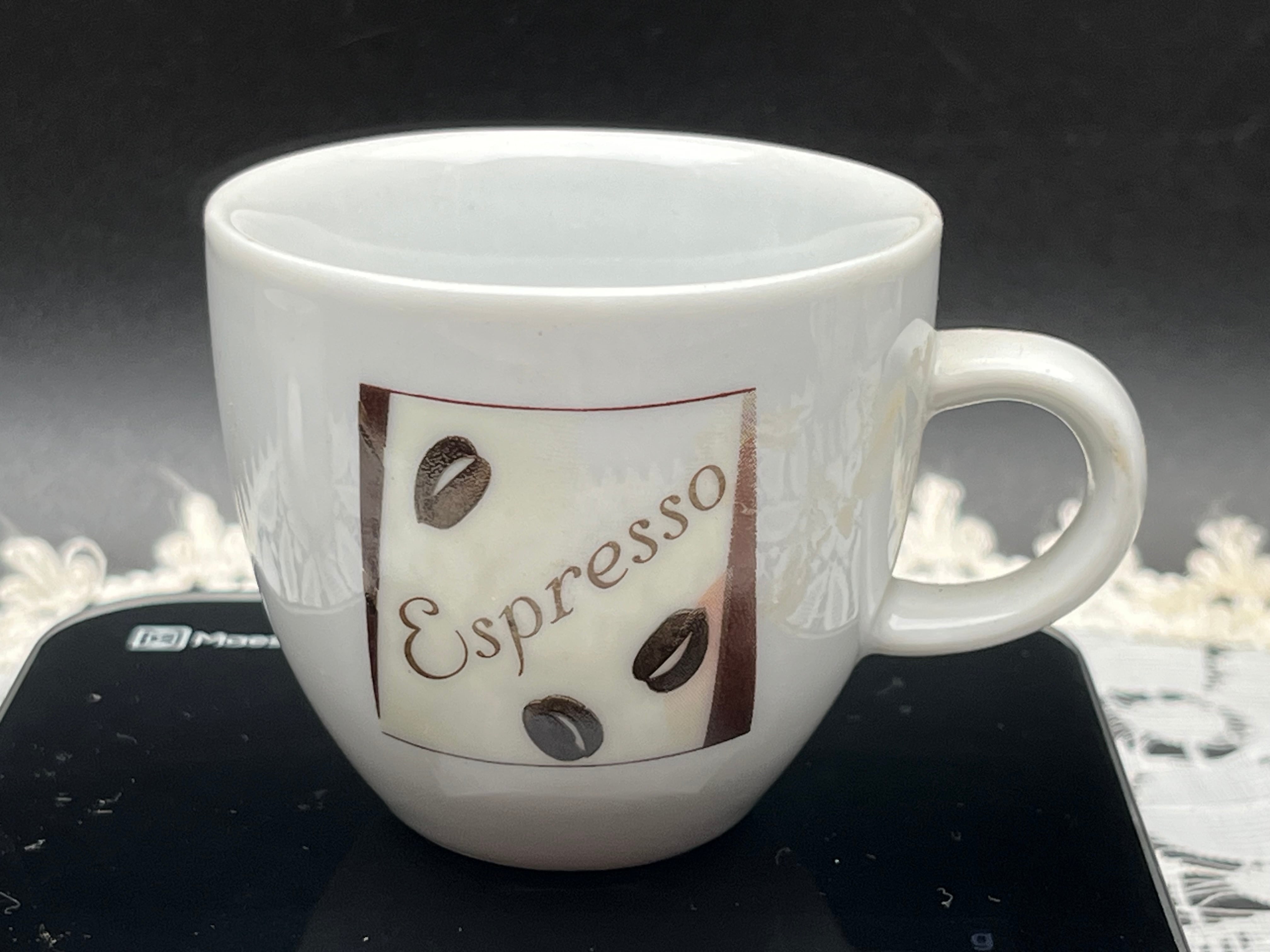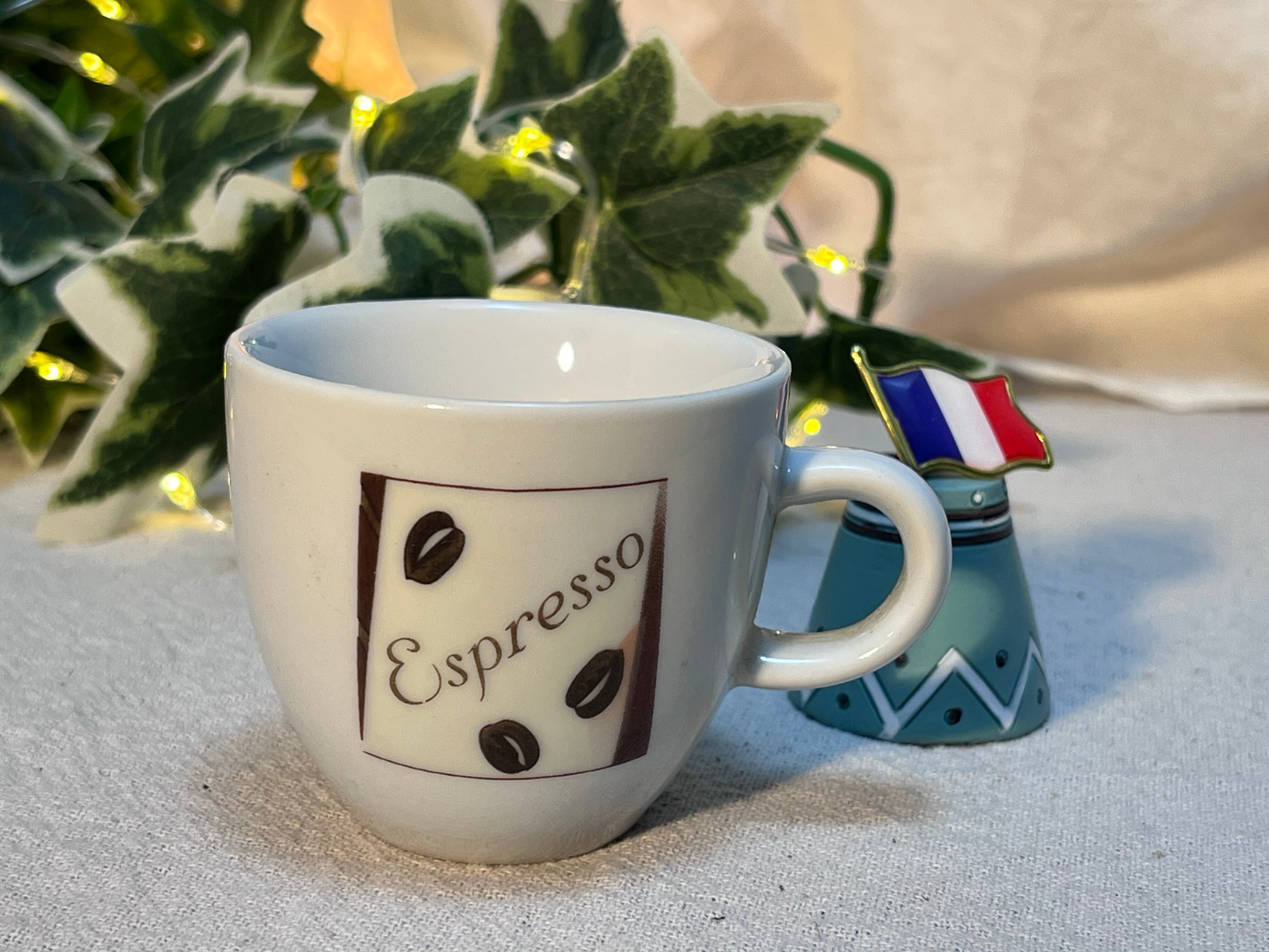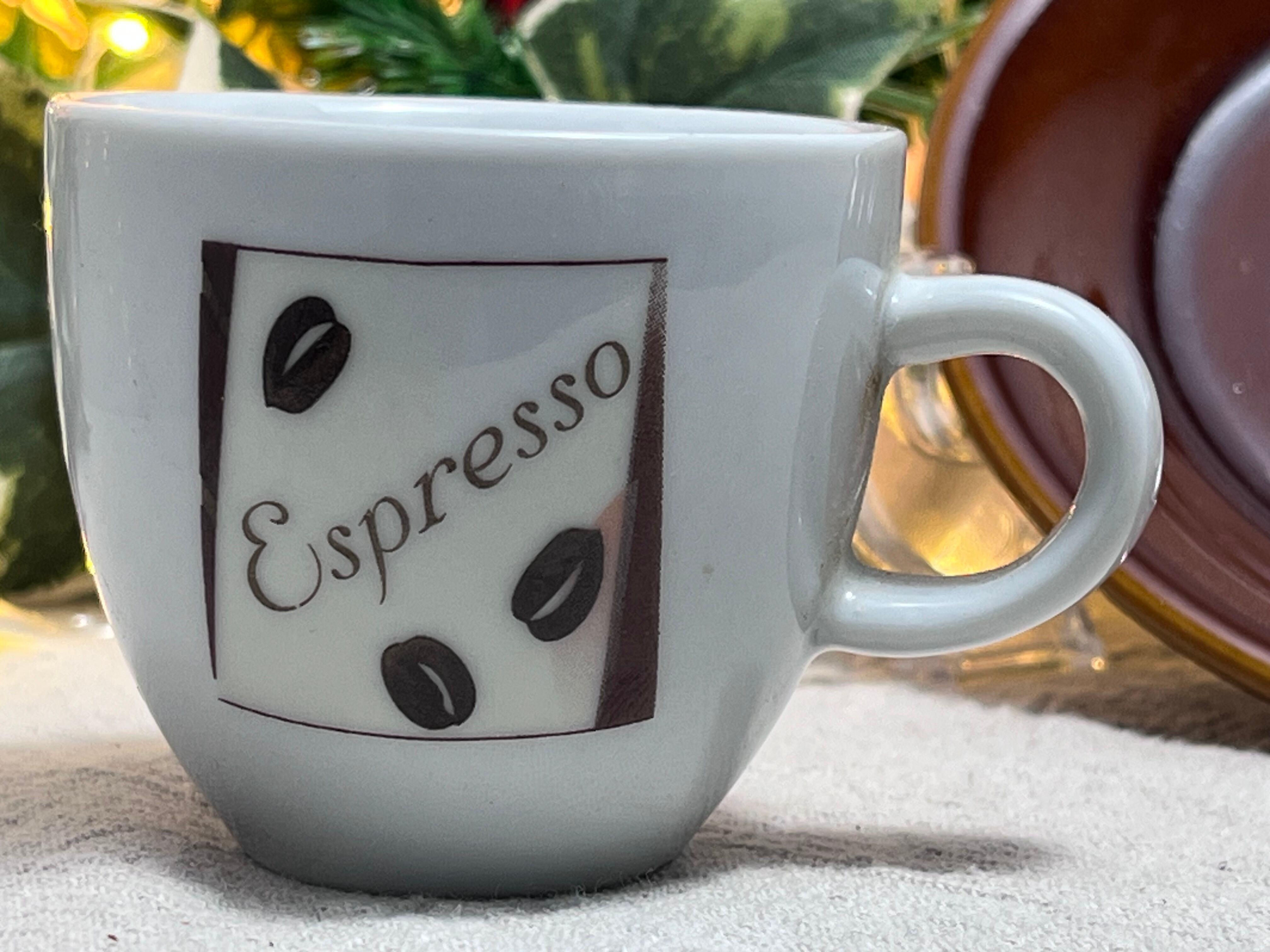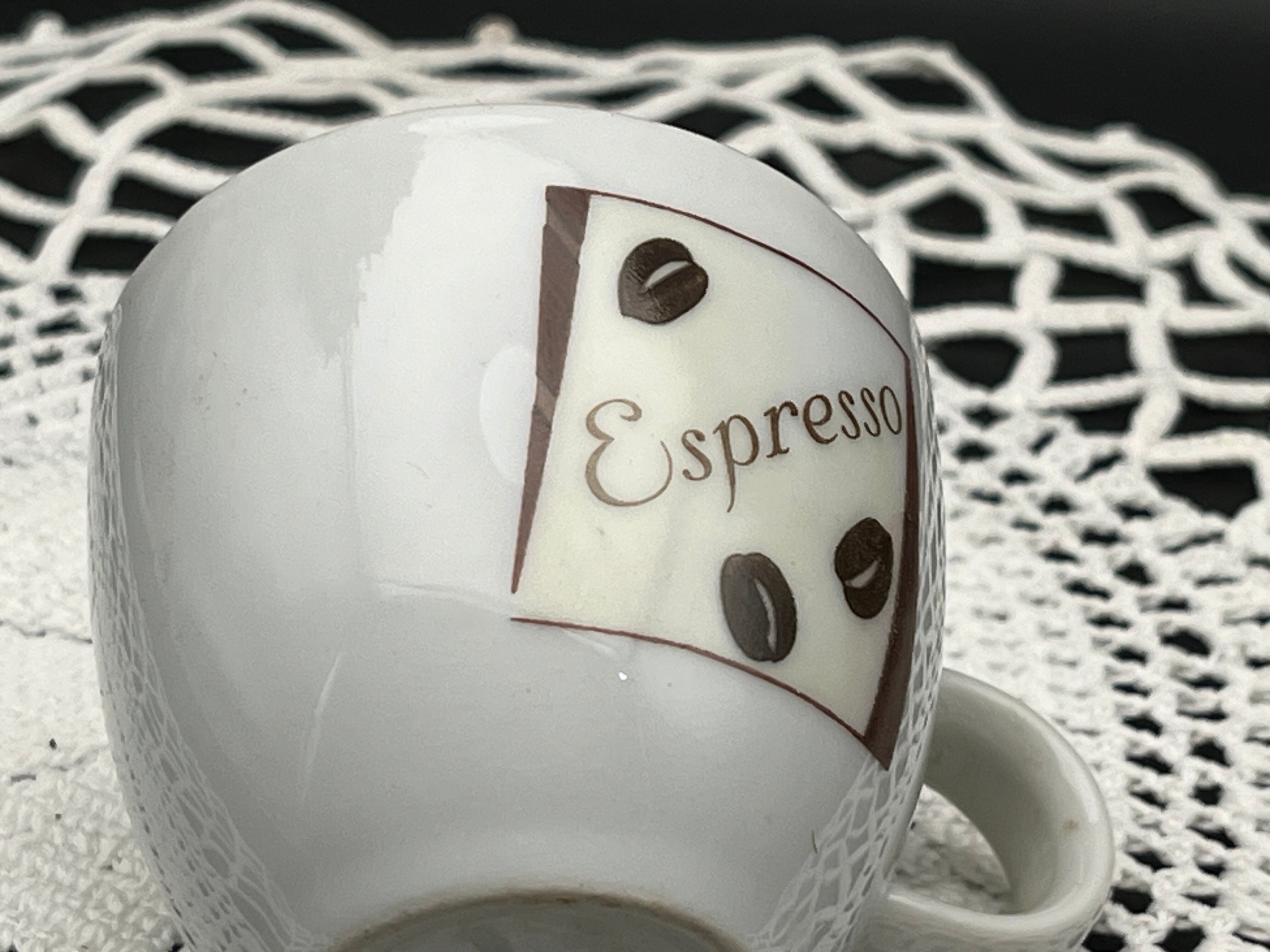 白磁の本体に「Espresso」のロゴとコーヒー豆がデザインされ、シンプルながらおしゃれな雰囲気を演出します。