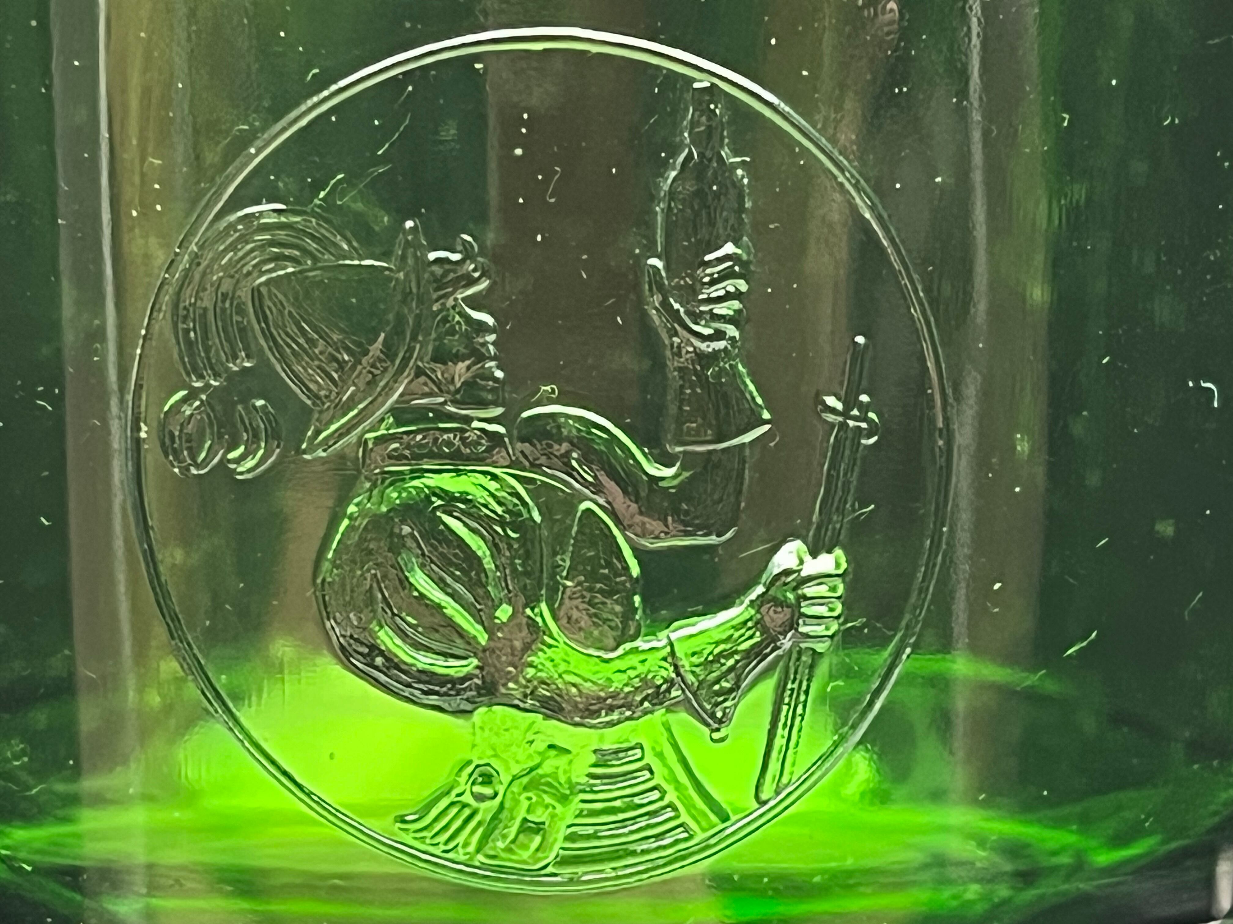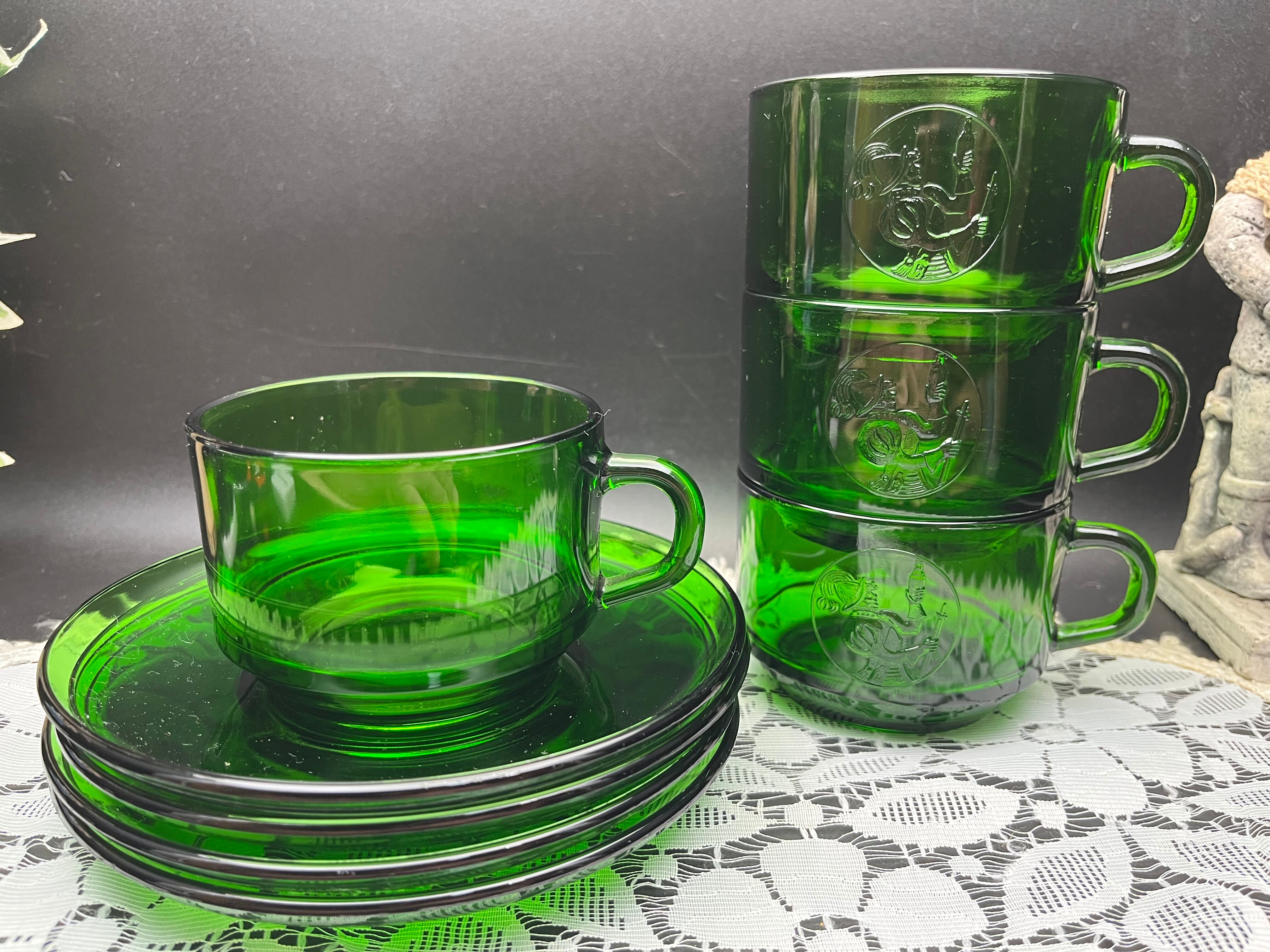 こちらは深みのあるエメラルドグリーンのガラスで作られた、カップ&ソーサーの4客セットです。カップには古風な装束の人物が酒瓶を掲げる姿がエンボスで刻まれており、西洋の酒文化や晩餐の雰囲気を漂わせる装飾が魅力です。