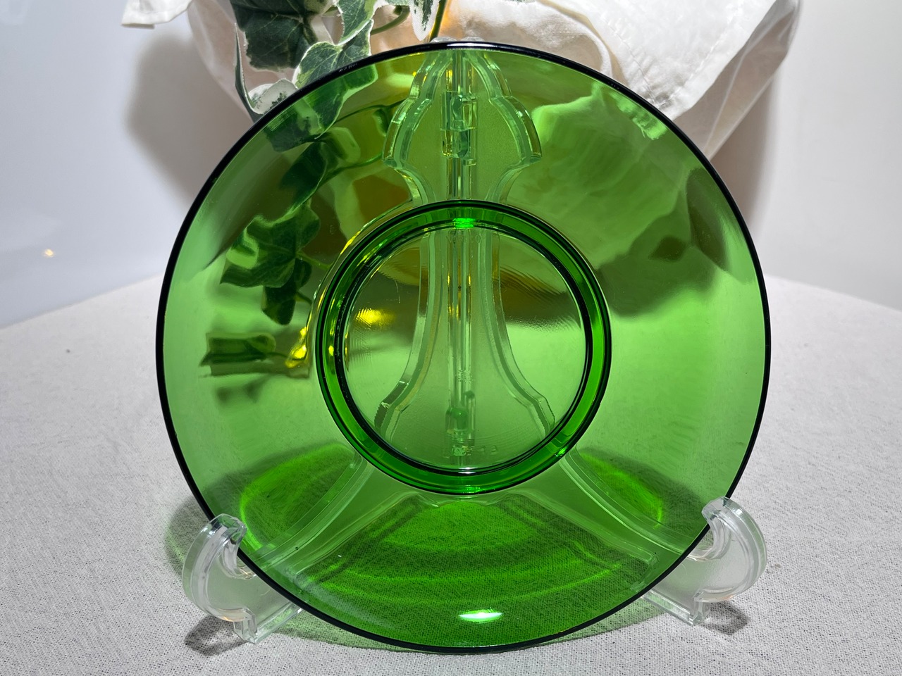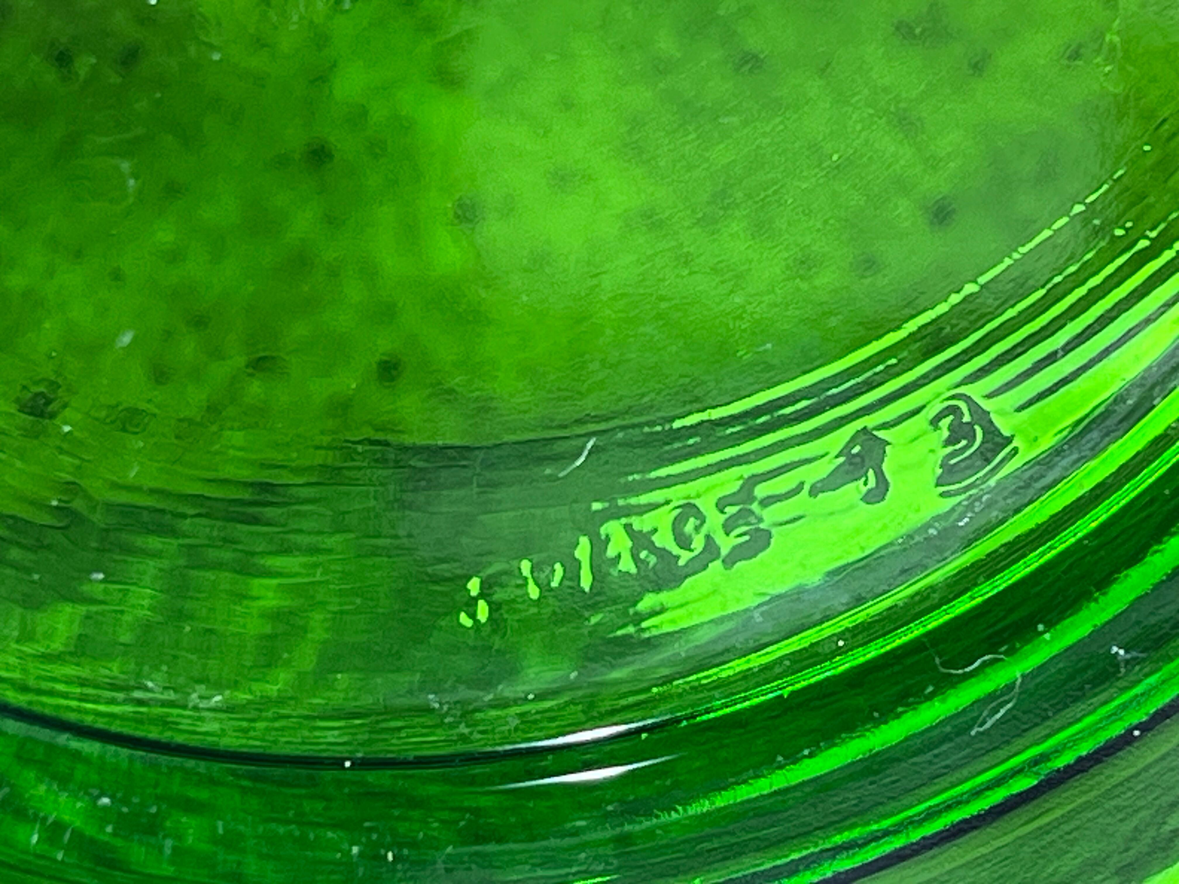 ガラスは透過性の高いグリーンで、光の加減によって鮮やかな輝きを放ちます。ソーサーの裏面には製造番号が確認でき、工房生産の証としてコレクション性を高めています。
