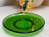 直径約16cmのソーサーと、実用性のある容量のカップは、ティーセットとしてはもちろん、インテリアオブジェやコレクターズアイテムとしてもおすすめです。20世紀中頃に流行した「カラードガラスウェア」を象徴するアイテムであり、当時のヨーロッパ食卓文化を感じさせてくれます。