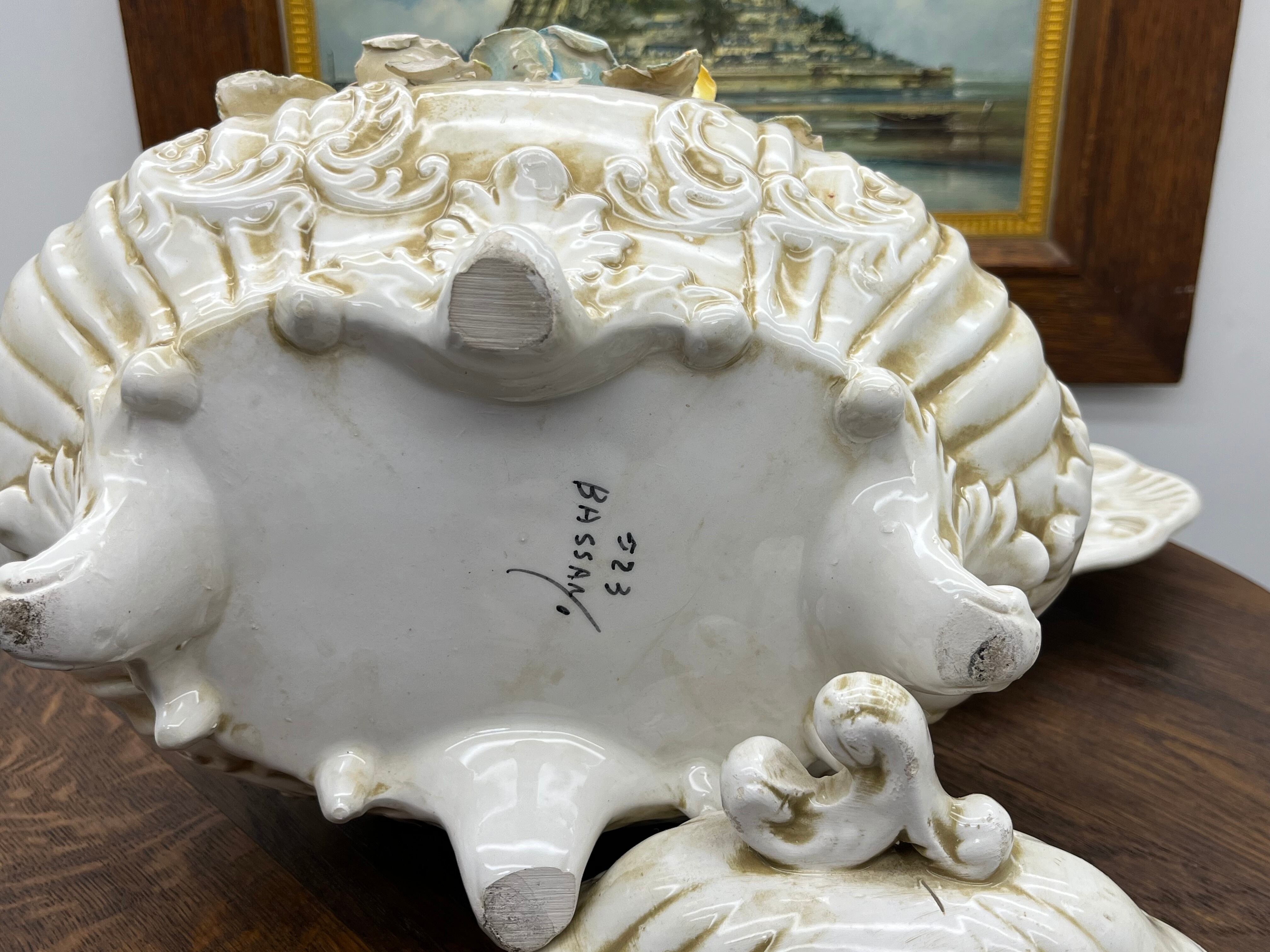 熟練の職人による手仕事の結晶。蓋に施された立体的な「陶花(薔薇)」が、お部屋に気品と彩りを与えます。底面には産地を示す「BASSANO」と型番号のサインが入った、確かな品質の逸品です。