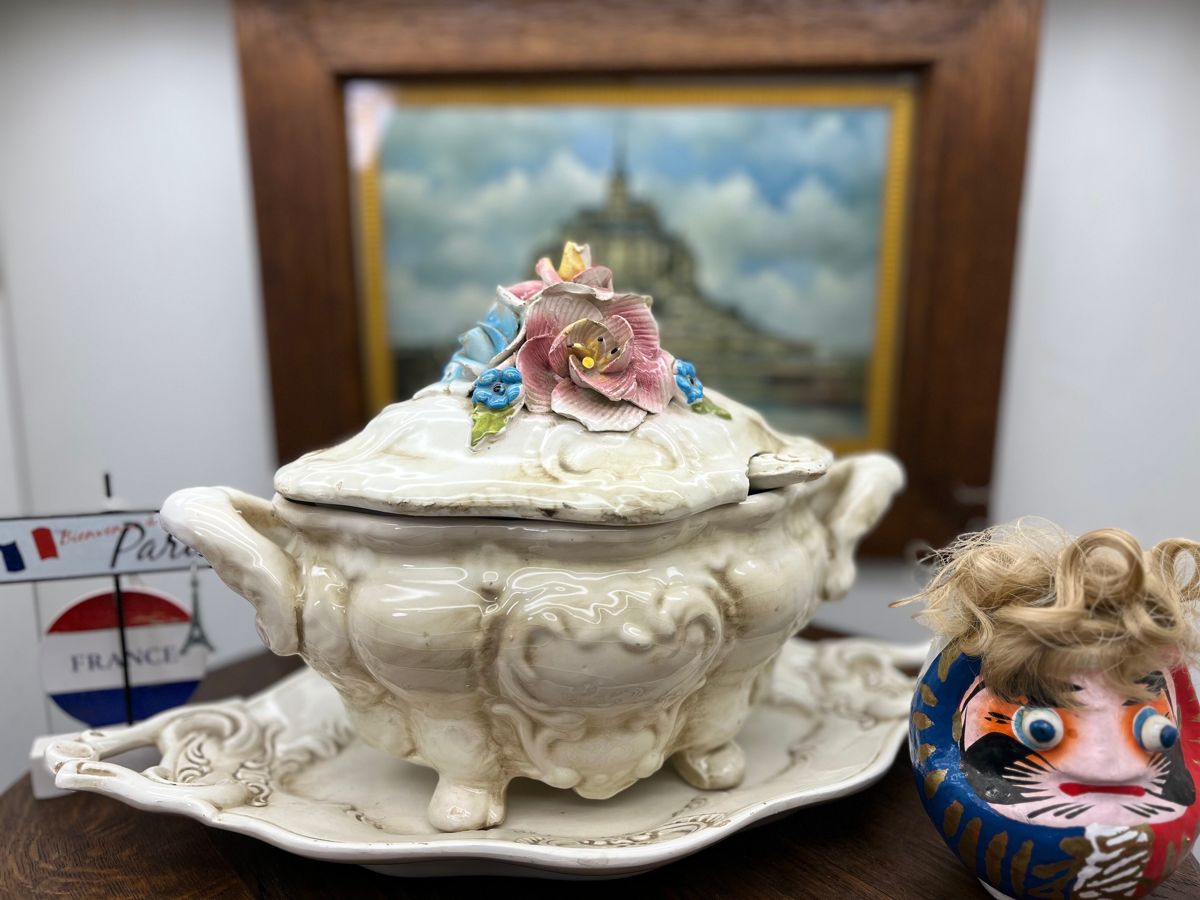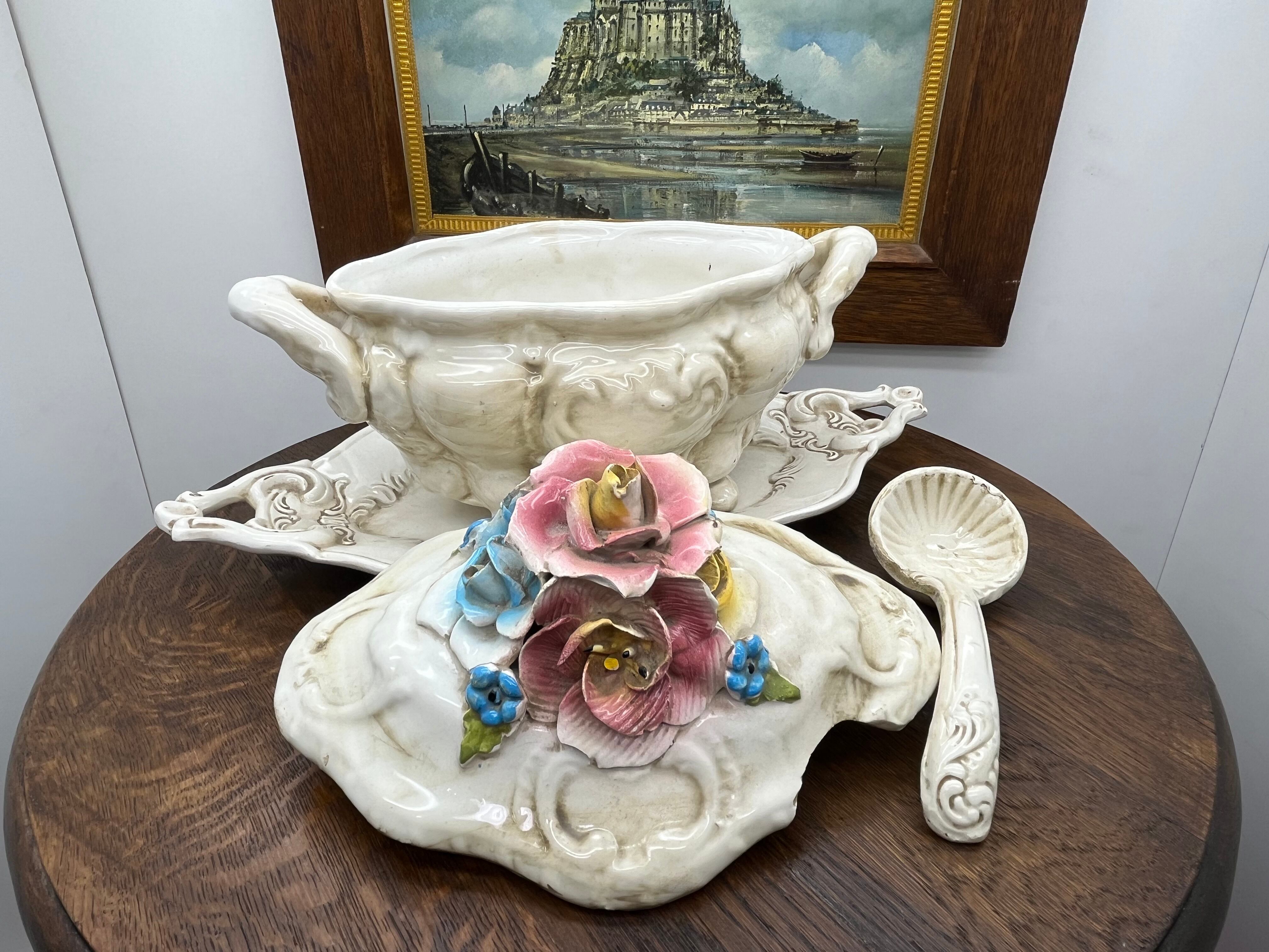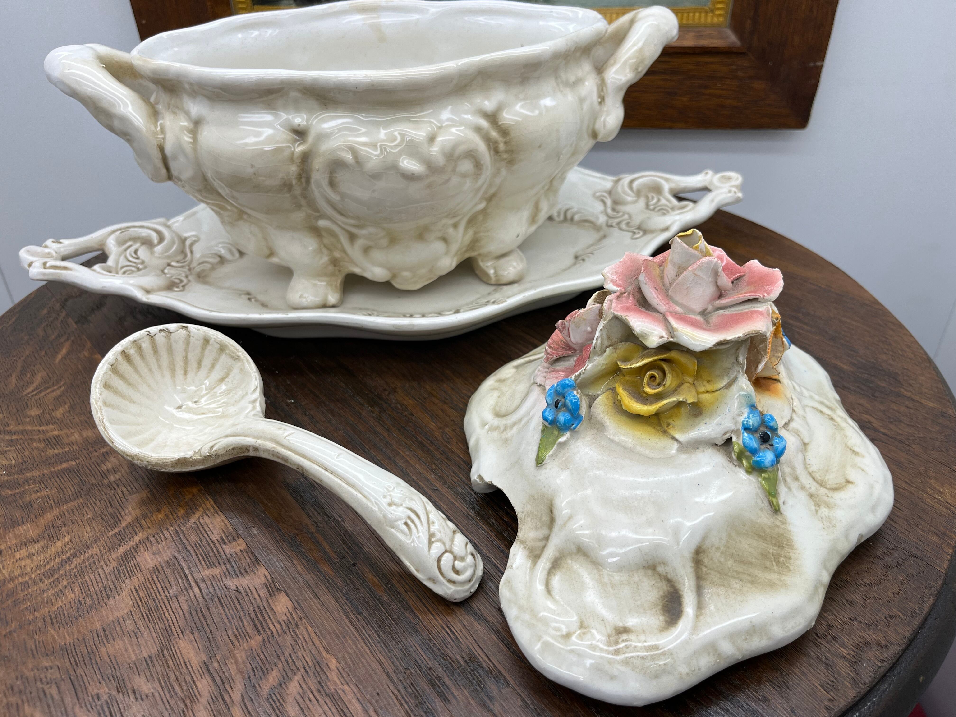 蓋、本体、アンダープレートに加え、現存数の少ない専用レードル(お玉)まで揃った貴重なコンディション。職人手作りの繊細な薔薇が、空間を華やかに彩ります。
